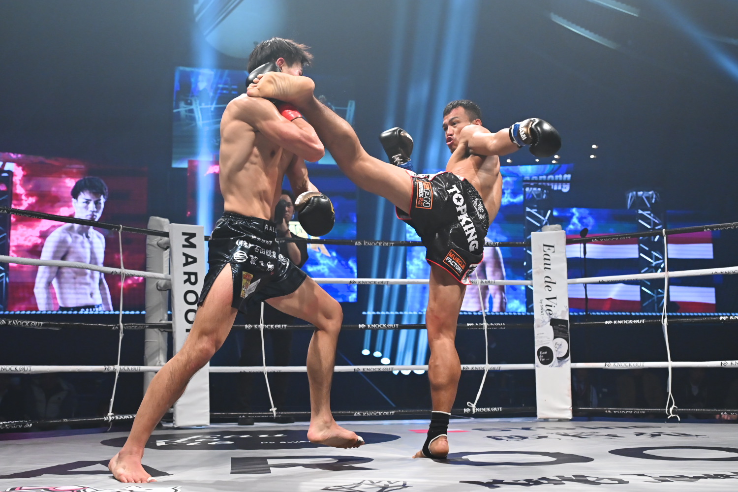 KNOCK OUTの1年の集大成となる「K.O CLIMAX」。前日会見でKNOCK OUTの山口元気代表は「12月30日を打撃格闘技の年末の風物詩にしたいというのを唱えてから2回目の開催で、本当にそれにふさわしいマッチメイクで選手たちが揃ってくれた」と自信たっぷりに語り、終盤には5階級のタイトルマッチが並べた。そのトリを飾ったのは元K-1王者のムエタイ戦士・ゴンナパーと、KNOCK OUT生え抜きの久井によるREDライト級タイトルマッチだ。