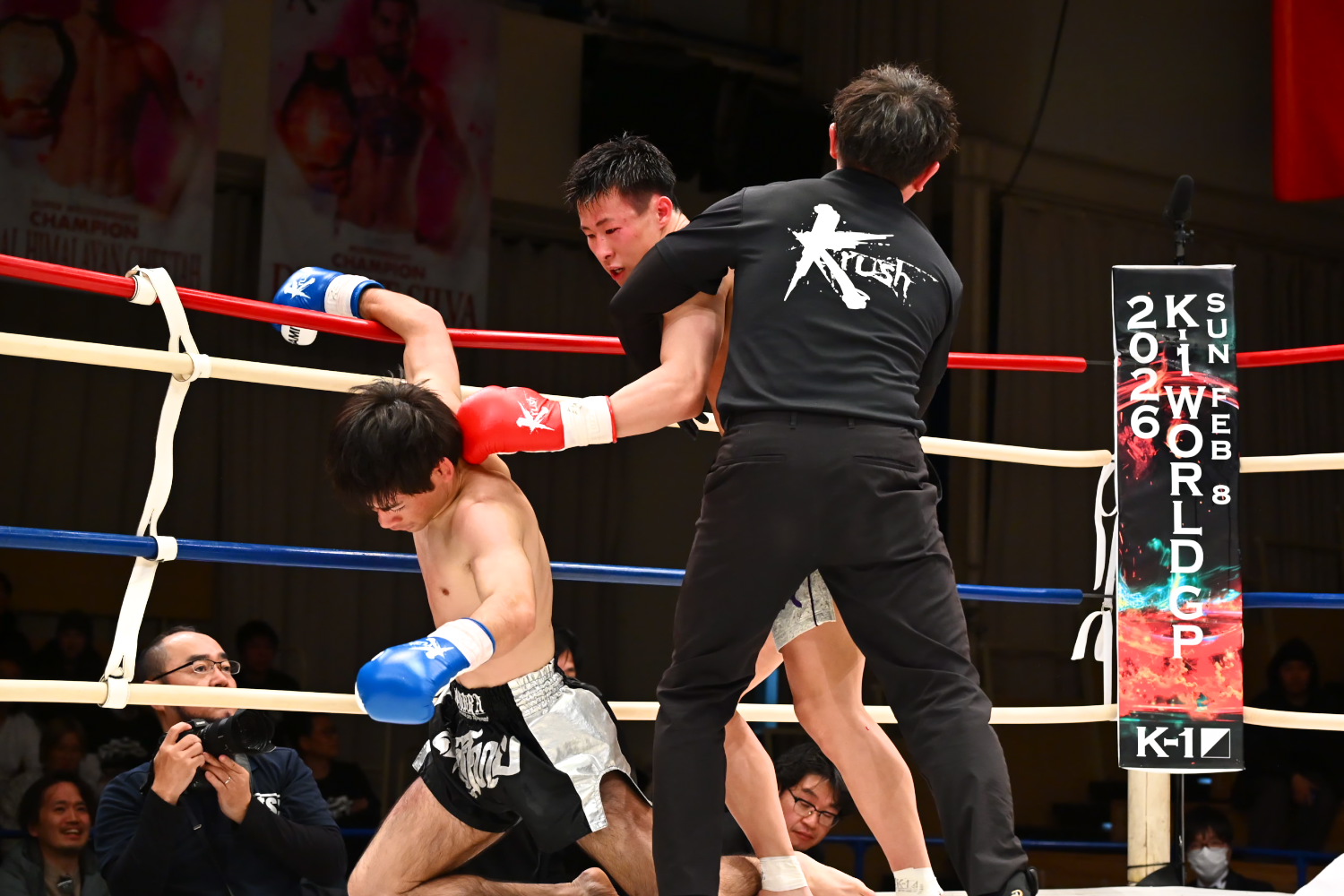 1R、東がサウスポーで構えて前に出続け、左のストレートを積極的に放つ。新井はオーソドックスを主体にしつつ、時折サウスポーにも切り替え、ストレート、ミドルを返すが、東のプレッシャーを前に下がる状態が続く。すると終盤、東がパンチのヒットを増やし。左ストレートでダウンを奪う。さらに東が左ストレートでダウンを奪ったところで、レフェリーがストップした。