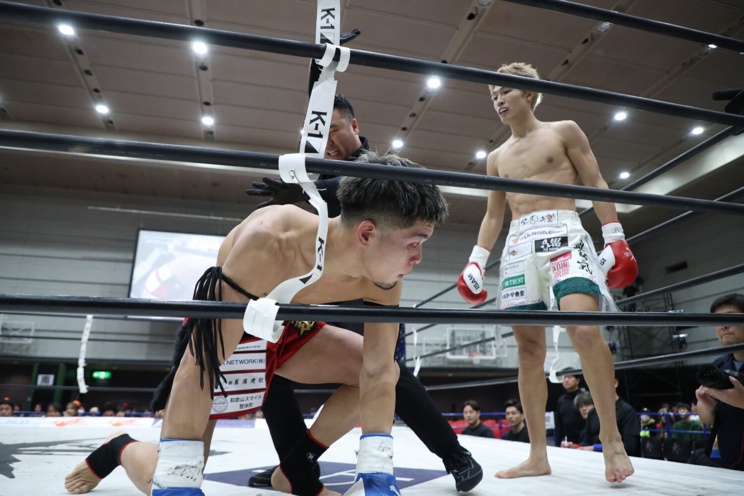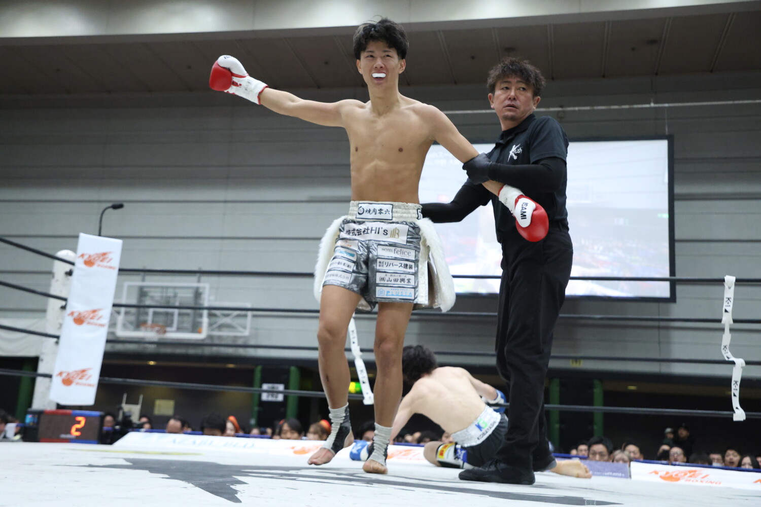 ※1R左ストレートで獅音に2ダウン。2R左ストレートで獅音に1ダウン
