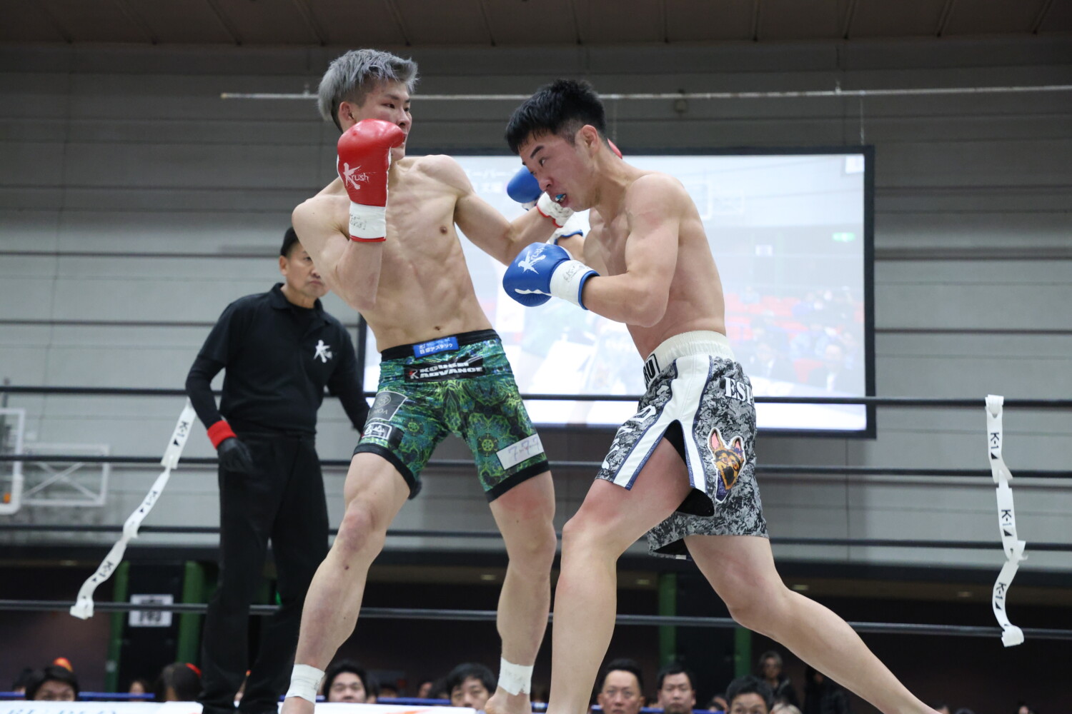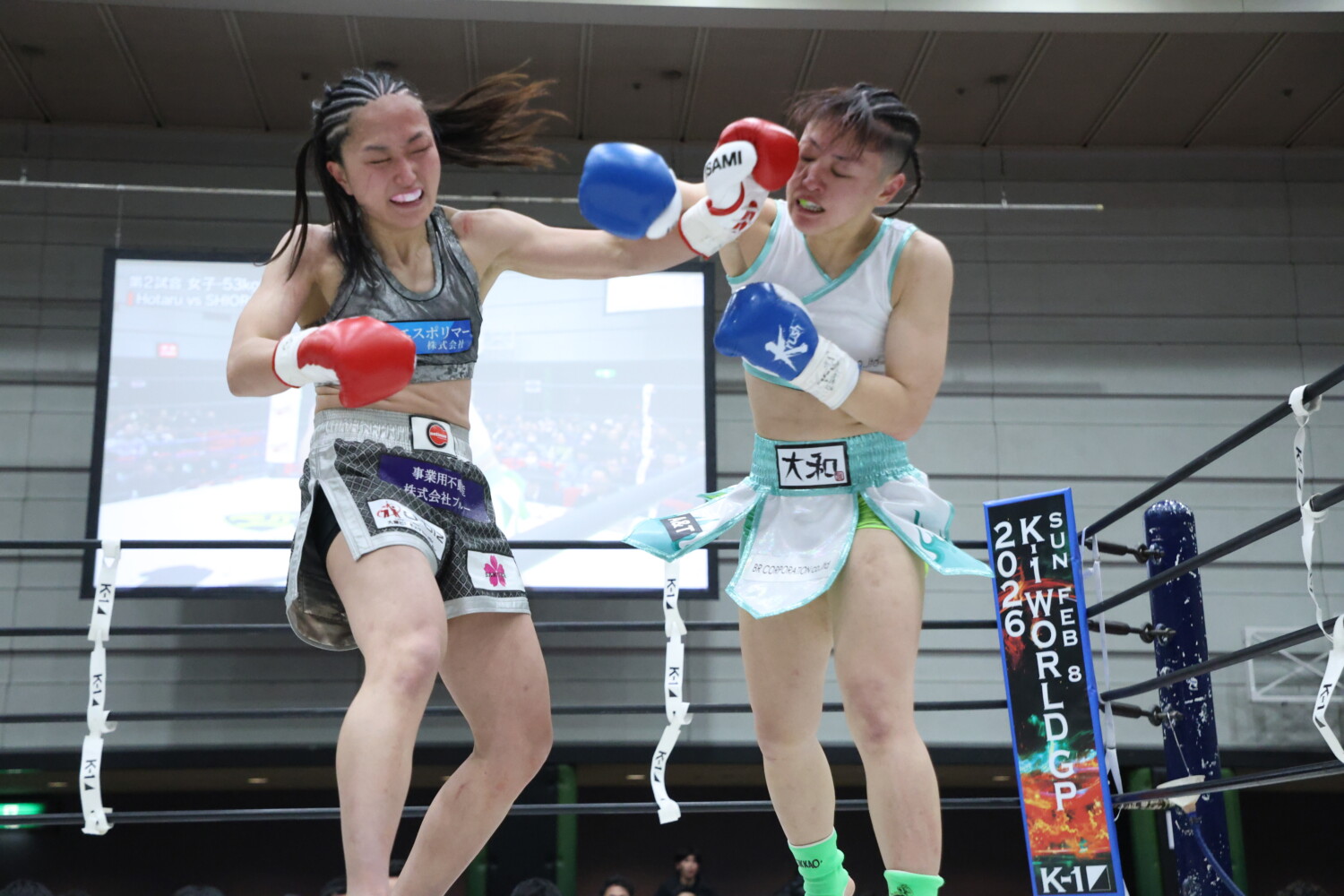 1R、両者サウスポーで構え、斗麗がプレッシャーをかけ、中盤過ぎからコーナー、ロープに詰め、左カーフ、ミドル、右の前手のフック、左フックを当てる頻度を上げる。まだ大脇はひるまないが、攻撃が返せない。記者採点は斗麗。