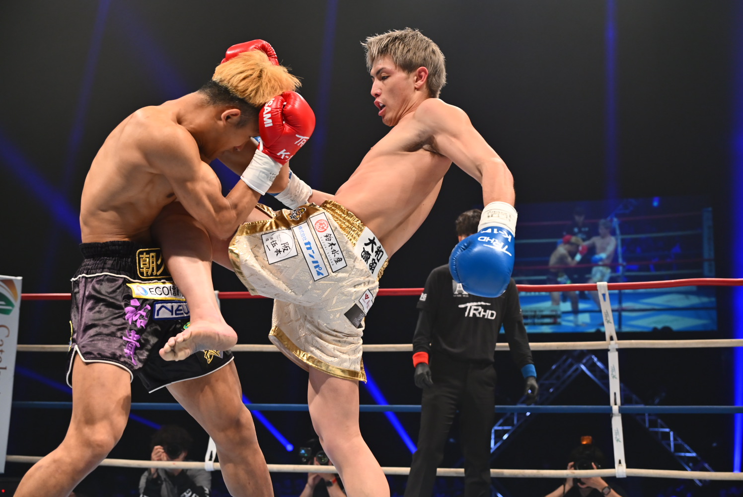 1R、サウスポーの里見に対し、序盤から朝久がスイッチを繰り返しつつ、右の三日月蹴り、前蹴り、左ミドル、左右のローを当てつつ、左ボディ等のパンチにもつなげ、手数で差を広げる。里見も時折右フックを返すが、流れを変えるほどにはならない。記者採点は朝久。
