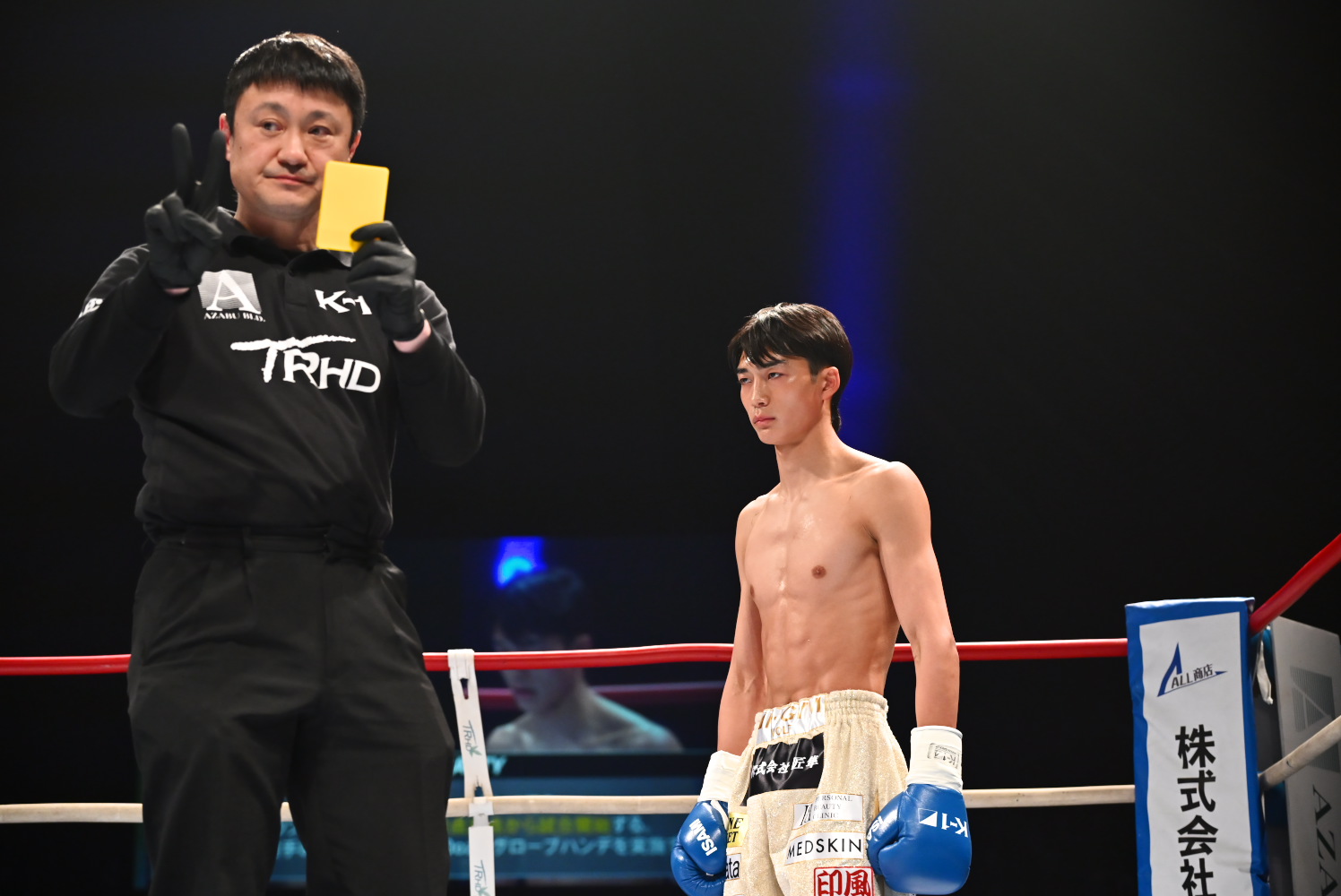 西京のダメージは大きく、永澤が再び左ボディでダウンを奪うと、レフェリーがストップした。だがこの際にも永澤は倒れて亀になった西京の体を蹴る反則を犯していたが、レフェリーの注意のアナウンスは無かった。