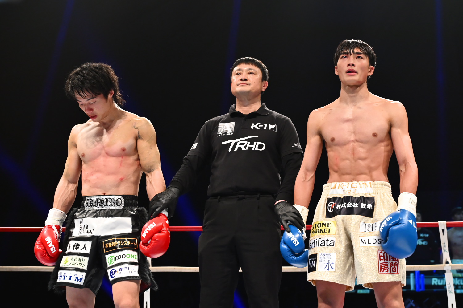3R、両者ともパンチを積極的に振るいつつ、ハイも絡め、途切れない一進一退の攻防で場内を沸かせる。やや朝久の動きが落ちているが、それでも攻撃を続け、里見もクリーンヒットにはつなげられない。記者採点はイーブン。合計29-29でイーブン。ジャッジ1者は朝久につけるが、2者はイーブンで延長へ。