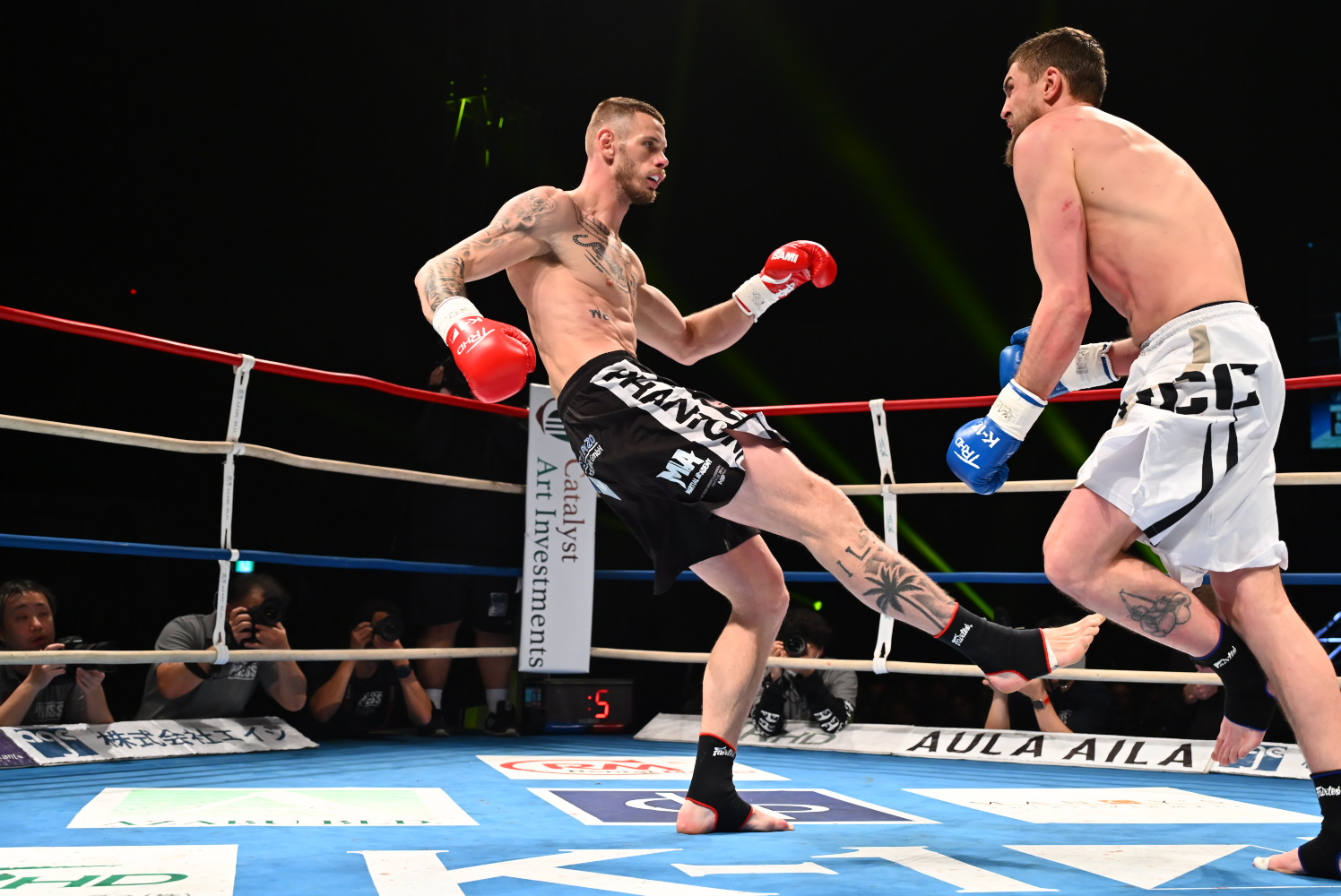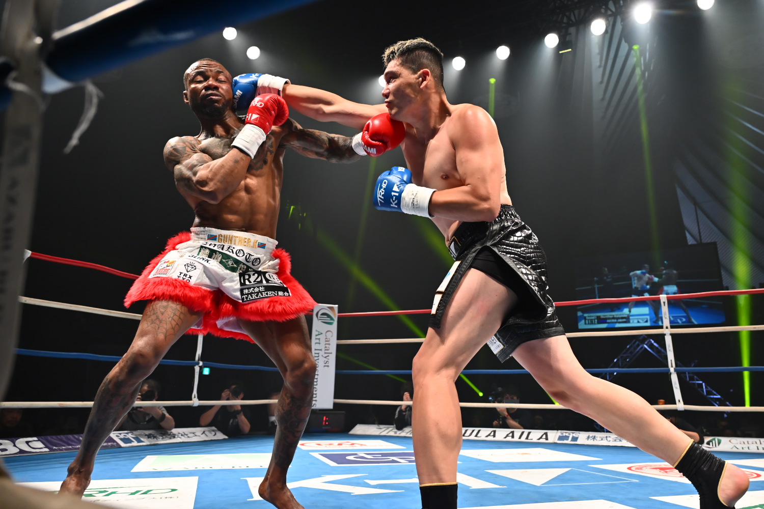 1R、カルンダが左フックを効かせ、左右のフックの連打でダウンを奪う。だが膝立ちのAKIRA Jr.にカルンダがパンチを当てる反則を犯し、一時中断する。カルンダに減点1が科される。すると再開後、回復したAKIRA Jr.が前に出てパンチを当て、右ストレートでダウンを奪い返す。