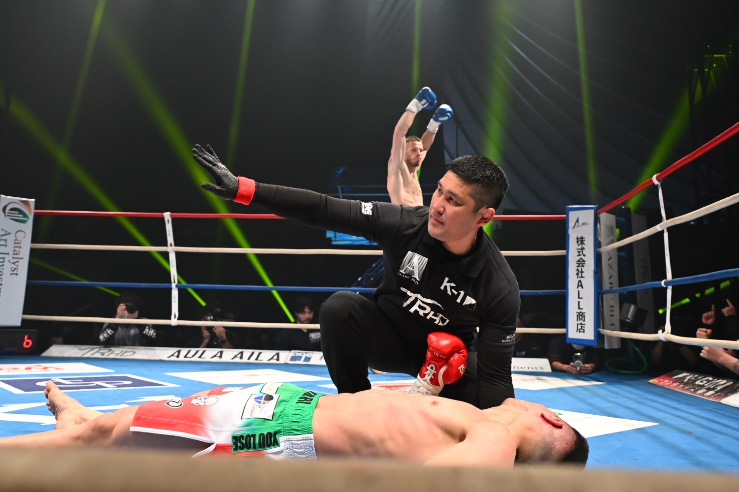 2R、ストイカが変わらず前に出てパンチを振るう。ホールディングが繰り返され、両者とも箱崎レフェリーから注意、警告、減点1を科される。だが減点の後、ストイカが一気に前に出ると、左フックをクリーンヒットしダウンを奪う。ファラオーニはダメージが大きく、すぐさまレフェリーがストップした。ファラオーニはストレッチャーで運ばれた。
