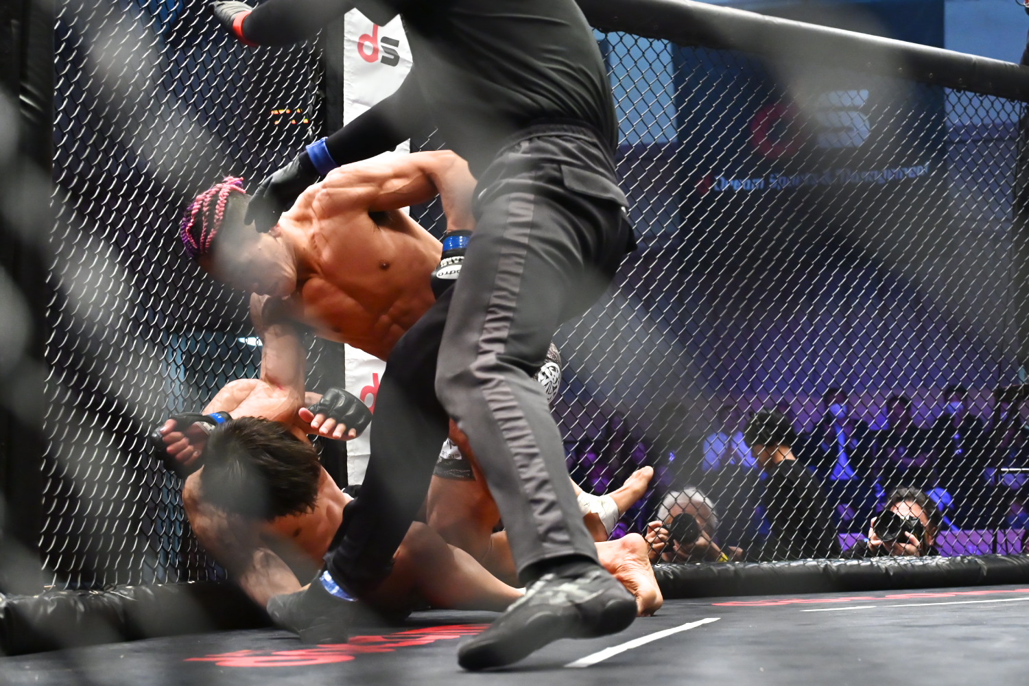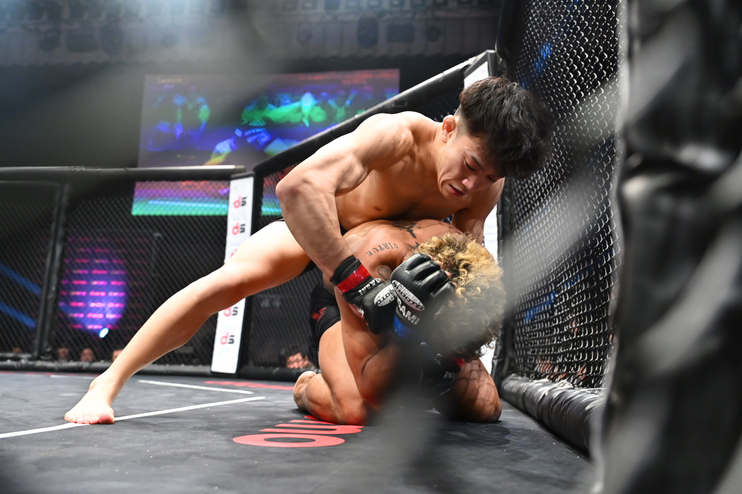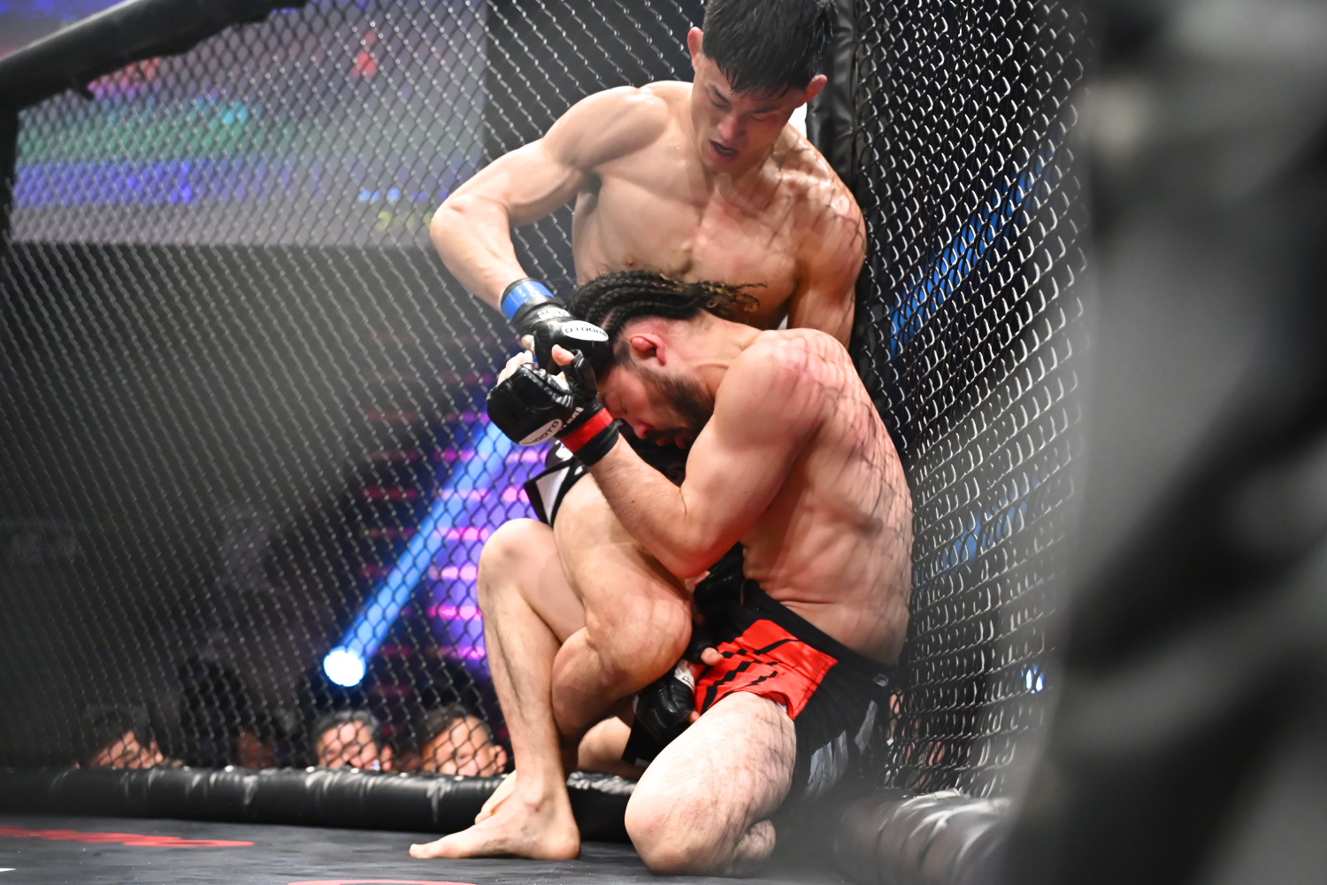 1R、松下が2度目のタックルでテイクダウンを奪い、金網際で押さえるが、その先の攻めが乏しい。終盤、宮城は脱出を狙う動きから、バックマウントを奪って形勢逆転し、裸絞めを狙いつつ鉄槌も当て、好印象で終える。記者採点は宮城。