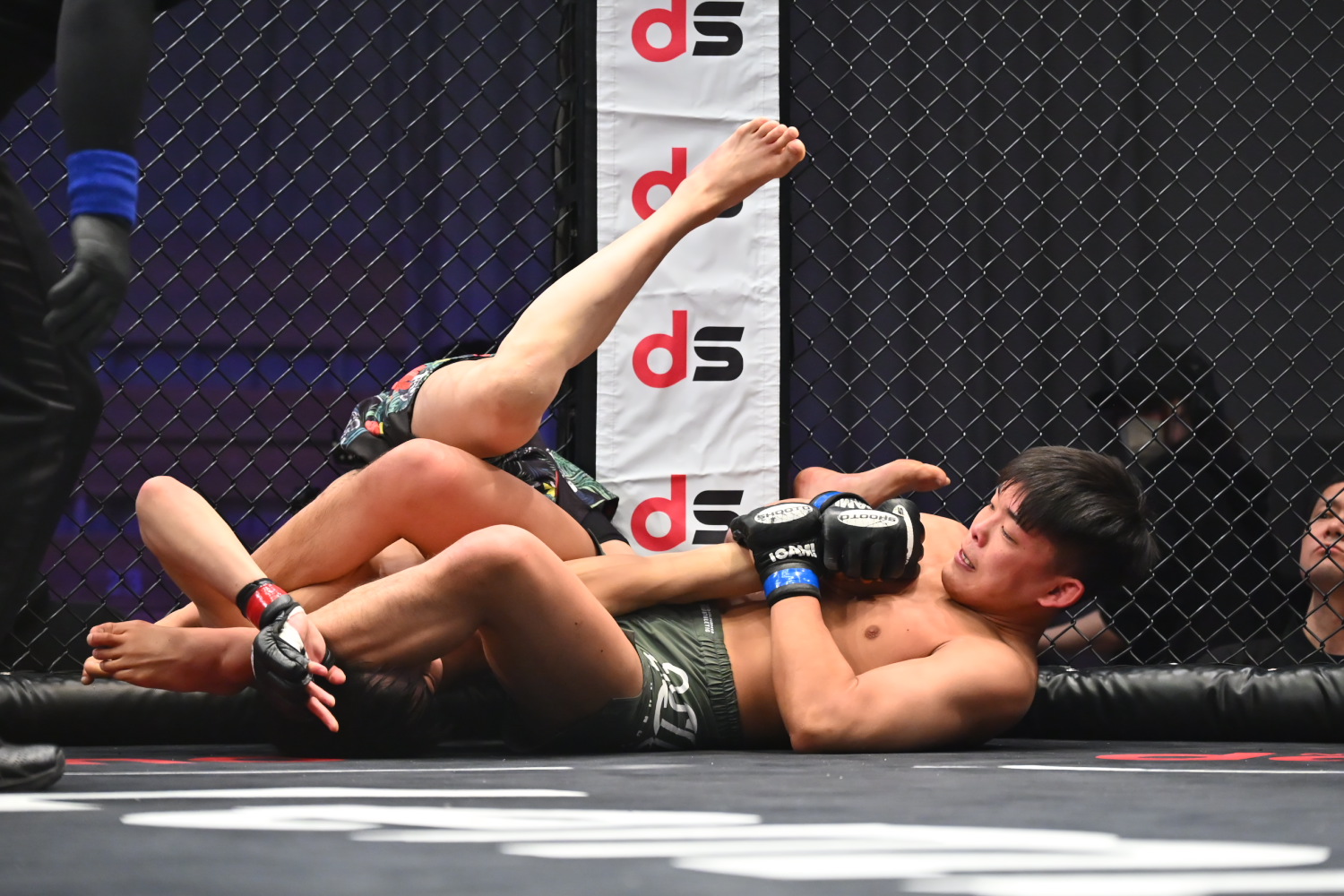 1R、内田は開始すぐからタックルを仕掛ける。青井はカウンターの膝蹴りを放つ。内田は被弾したが、そのままタックルで倒し、すぐさまマウントを奪う。内田は肩固めを狙い、青井が返そうとすると、腕十字を極めタップを奪った。