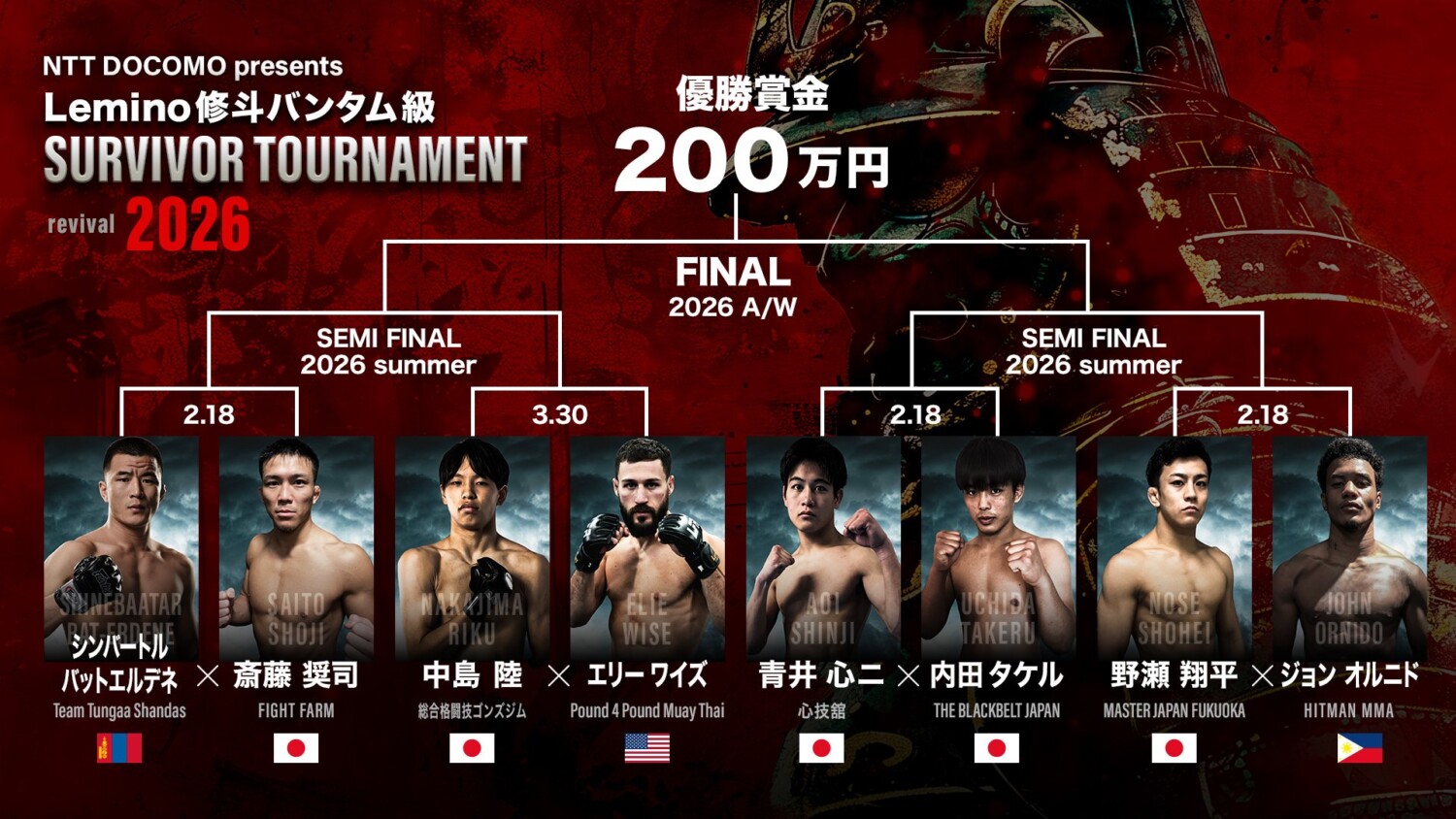 Lemino修斗.3ではトーナメント一回戦のうち3試合が行われる。残り1試合、中島陸(ゴンズジム/世界10位、環太平洋9位、2025年同級新人王)vs. エリー・ワイズ(米国/パウンド4パウンドムエタイ)はLemino修斗.4(3月30日(月) 後楽園ホール)で行われる。夏の大会で準決勝、秋から冬の大会で決勝を開催予定。優勝賞金は200万円。開催概要によると「(5月の)Road to UFCからオファーを受けた場合はトーナメント期間中においても途中離脱を許可する」という。