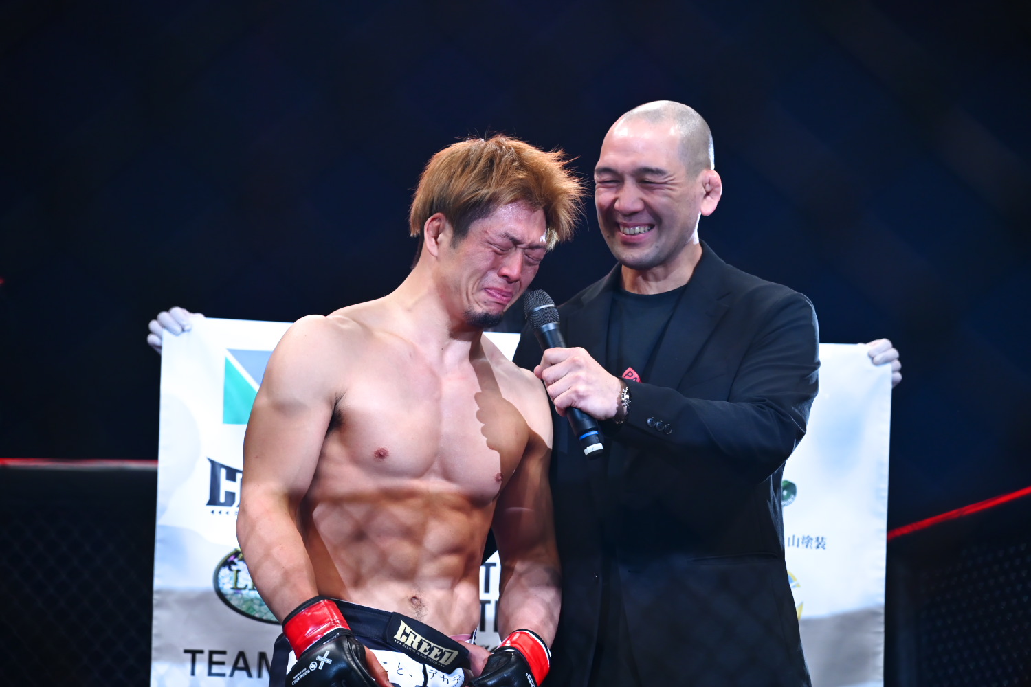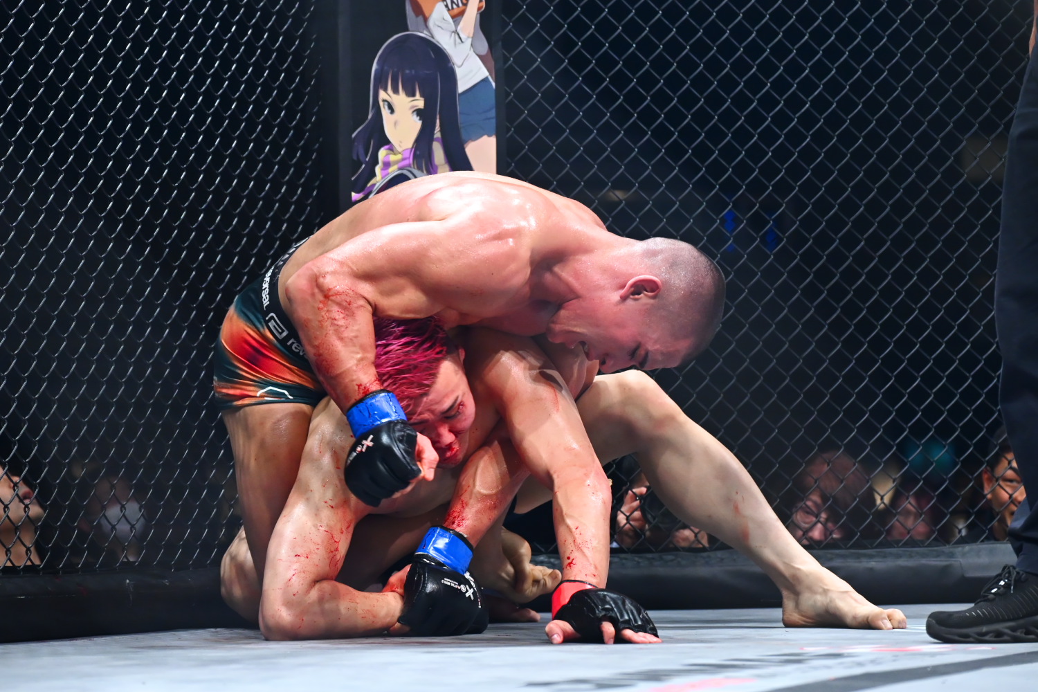 1R、ナカガワが透暉鷹の前蹴りをつかんで引き込み下になる。ナカガワは下から首を抱えたり足を登らせようとするが、透暉鷹は対処すると、体を起こしてパウンドを連打する。すると透暉鷹が一方的に当て続け、ナカガワが体を背けて防戦一方になる状態が続き、最後は金子レフェリーがストップする前に、ケージサイドの審判が笛を鳴らして試合を終わらせた。透暉鷹は急きょ試合を受けたナカガワ、練習仲間や家族に感謝を述べつつ、涙を流して勝利を喜んだ。