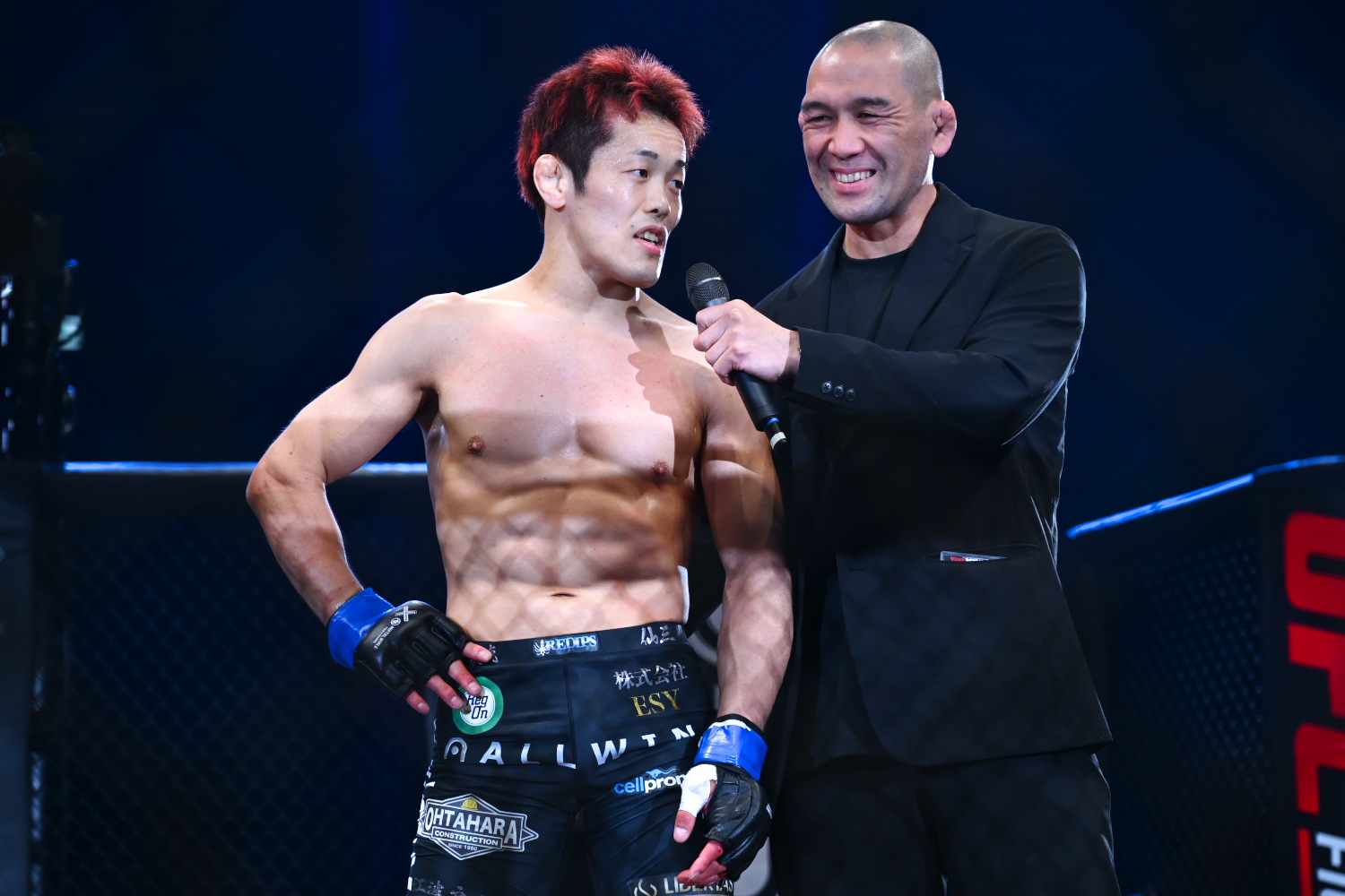 すると2R開始すぐ、猿飛流が「アップでやってみて当たると思った」というバックスピンキックをクリーンヒット。吹き飛んだ大塚に、猿飛流がパウンドを当て続けたところでレフェリーがストップした。
