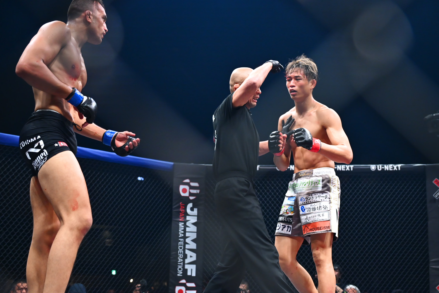2Rも同様で、山木は右ボディを当てるが、中盤からは荒田のバックマウントで捕まり続ける。荒田は裸絞めを狙い、終盤には時折パウンドを当て、打撃でも攻め、1Rよりもジャッジに良い印象を残す。記者採点は荒田。