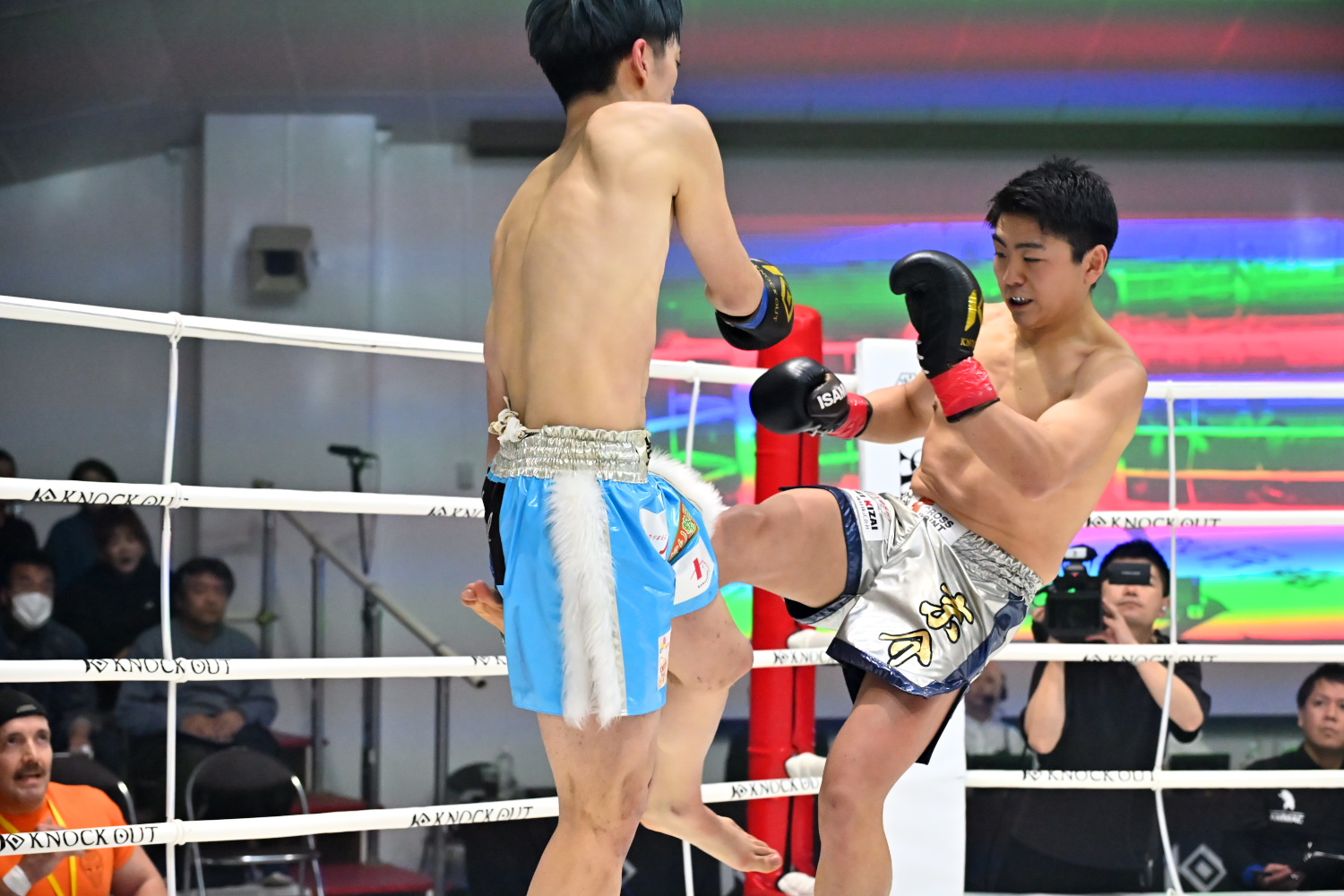 1R、サウスポーの祐輝に対し、歩希がオーソドックスからの右ロー、ミドルと攻撃を散らした後、祐輝の入り際に右ストレートを合わせ、序盤からダウンを奪う。終盤にも歩希が右ストレートを連打してダウンを奪う。歩希が7-10でポイントを取る。
