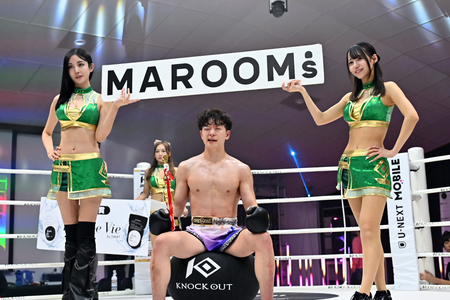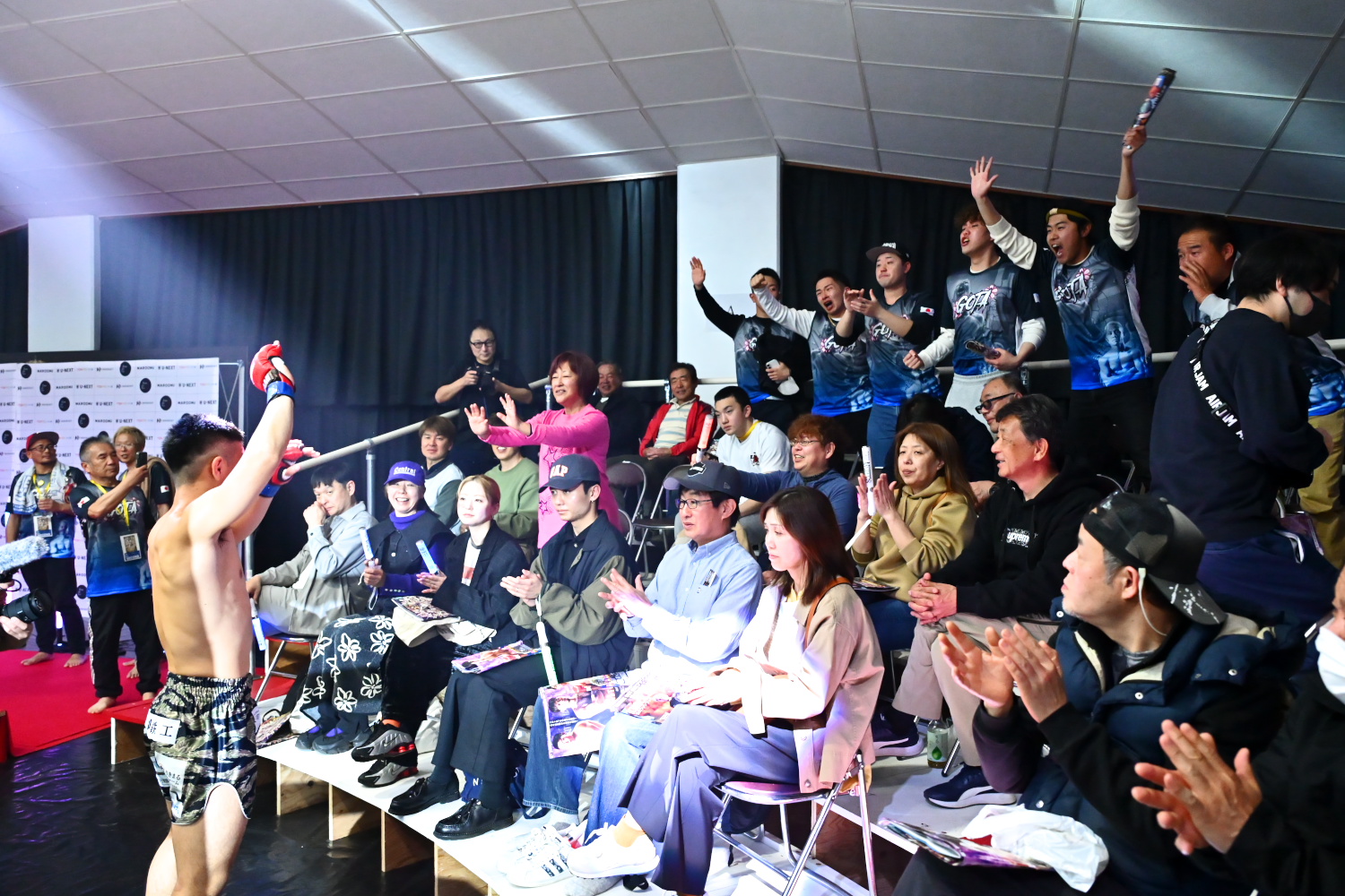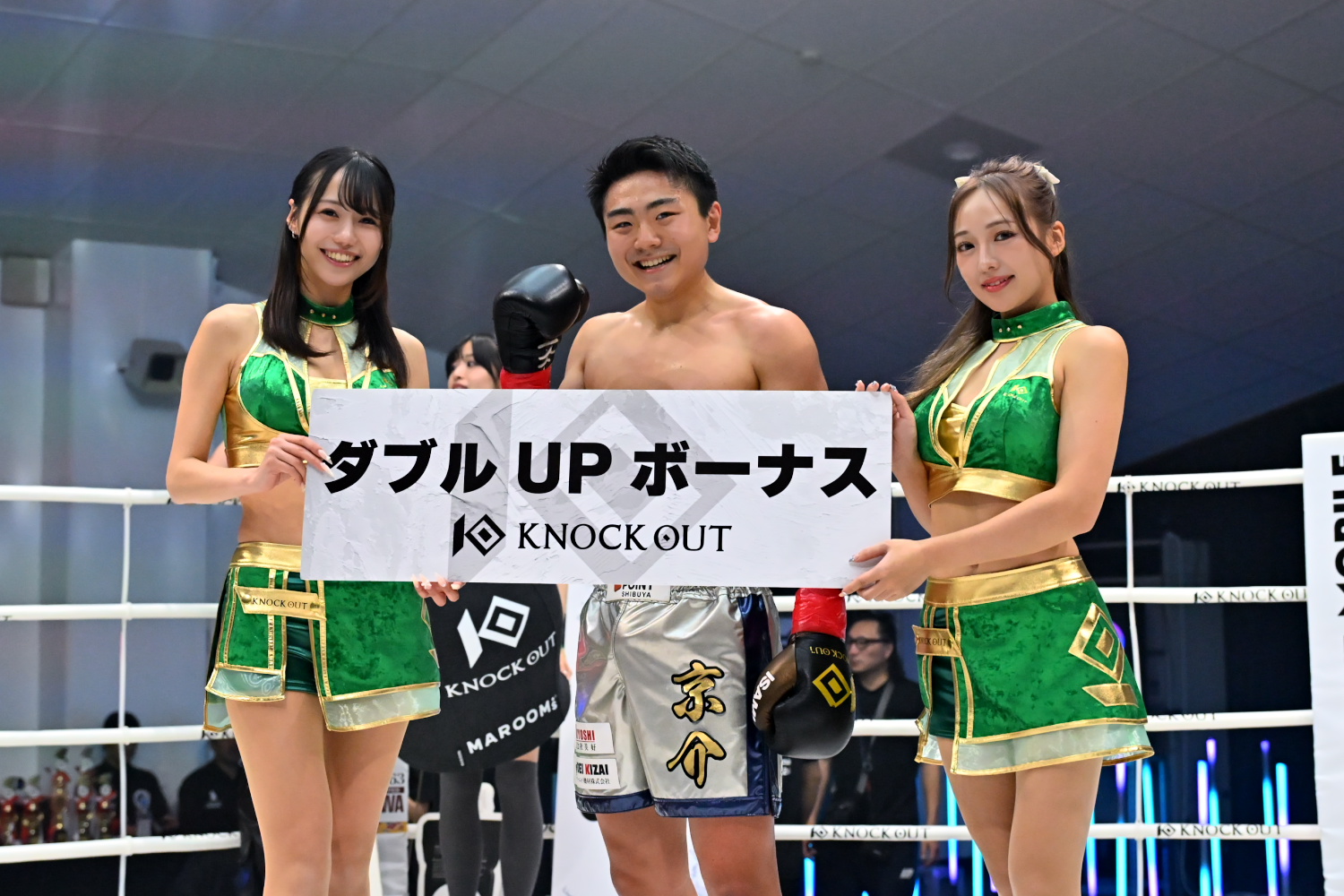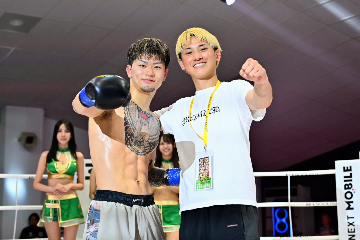 さらに力斗は「僕の父ちゃんが2日前が誕生日で、減量がキツくてメッセージを送れなかったけど、誕生日おめでとう。塩試合でしたが、いつかは必ず本物の一番になるんで、力斗、同じジムの武内晴信の応援をお願いします」とアピールした。最後はこの日の序盤戦でKO勝ちした武内と記念撮影した。