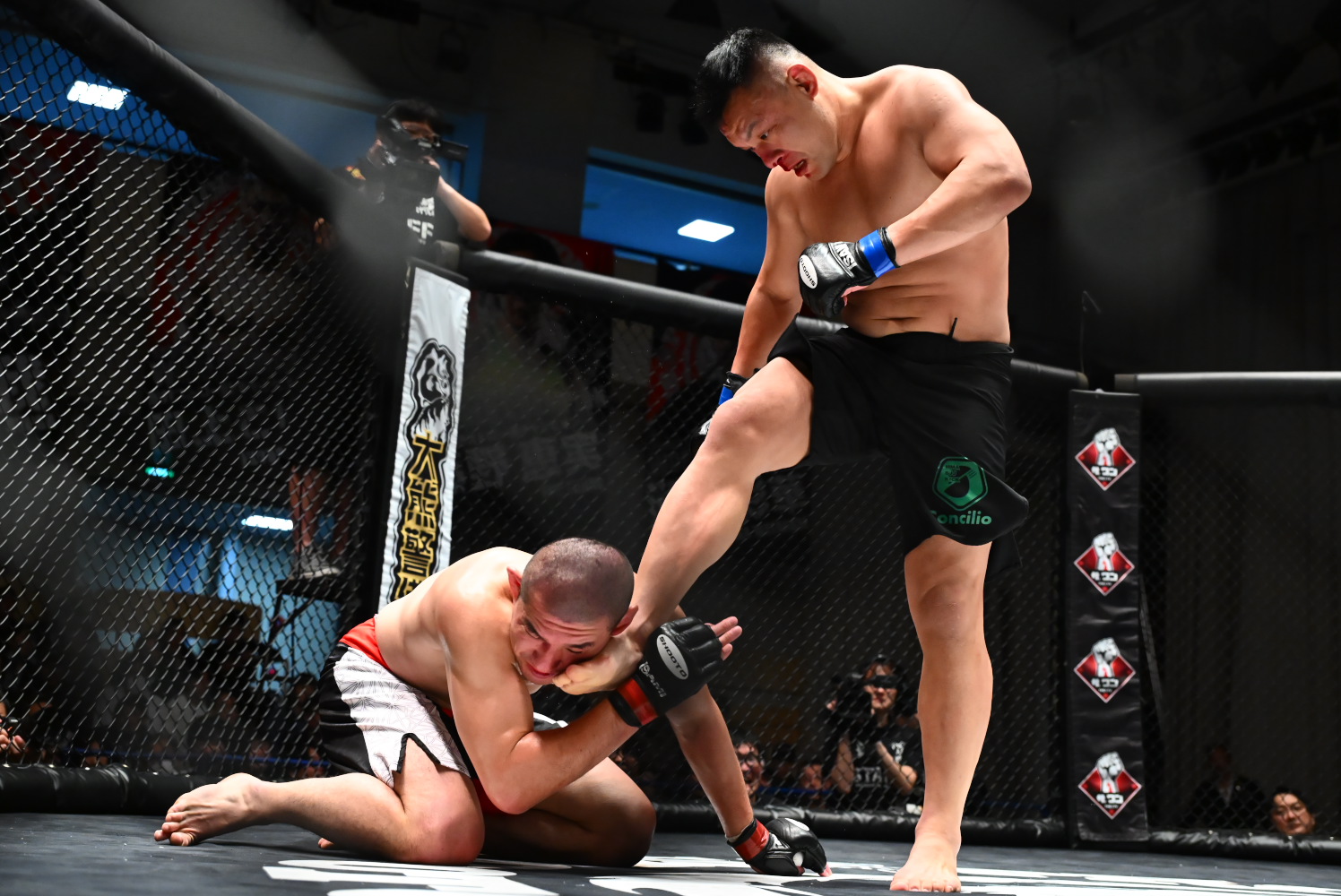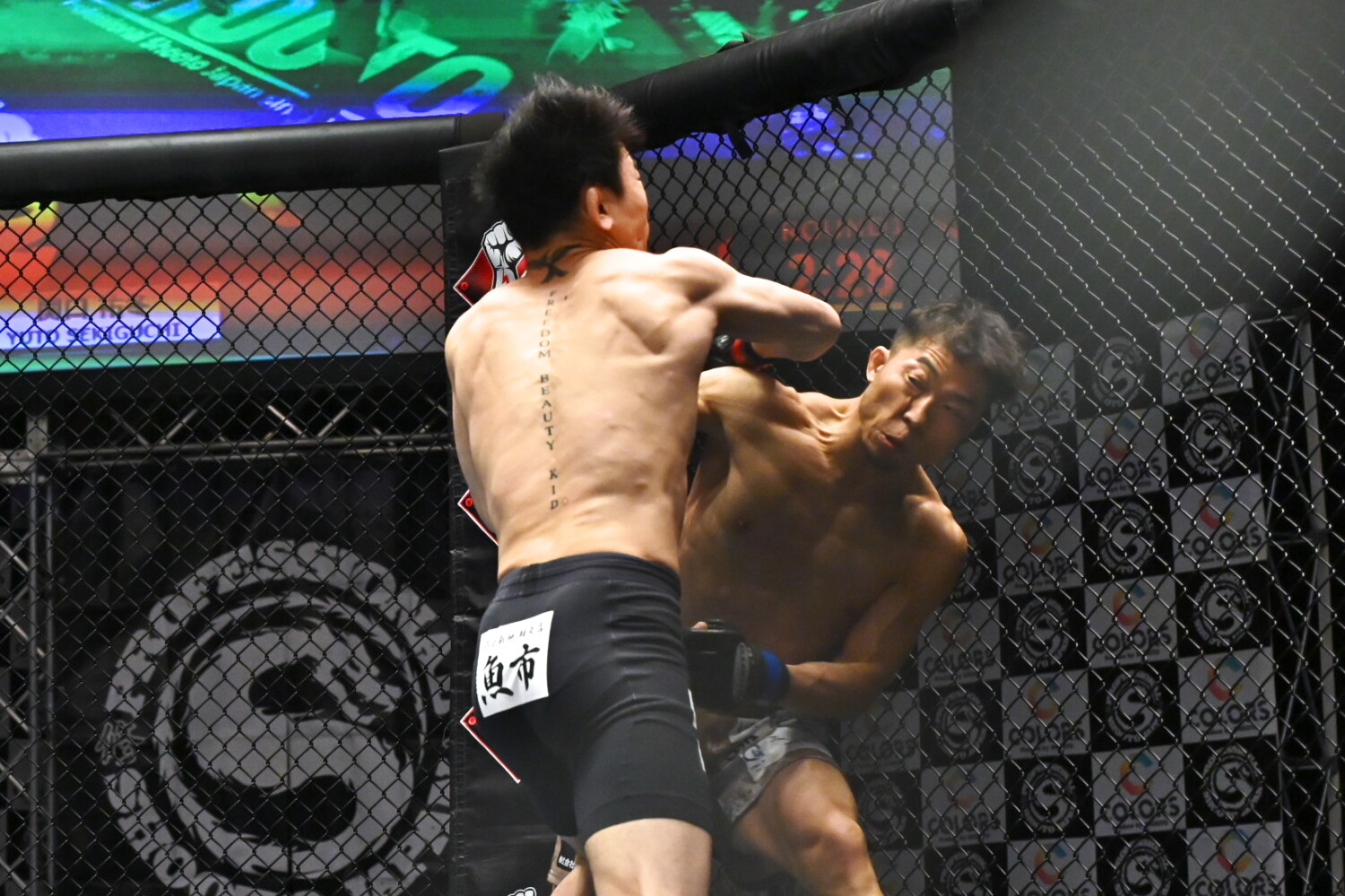 1R、序盤から荒井がタックルで倒して上になり、パウンドを当て、立たれても金網に押し込む。打撃戦では最後、沙門が前に出て右フックを当て、やや好印象で終える。