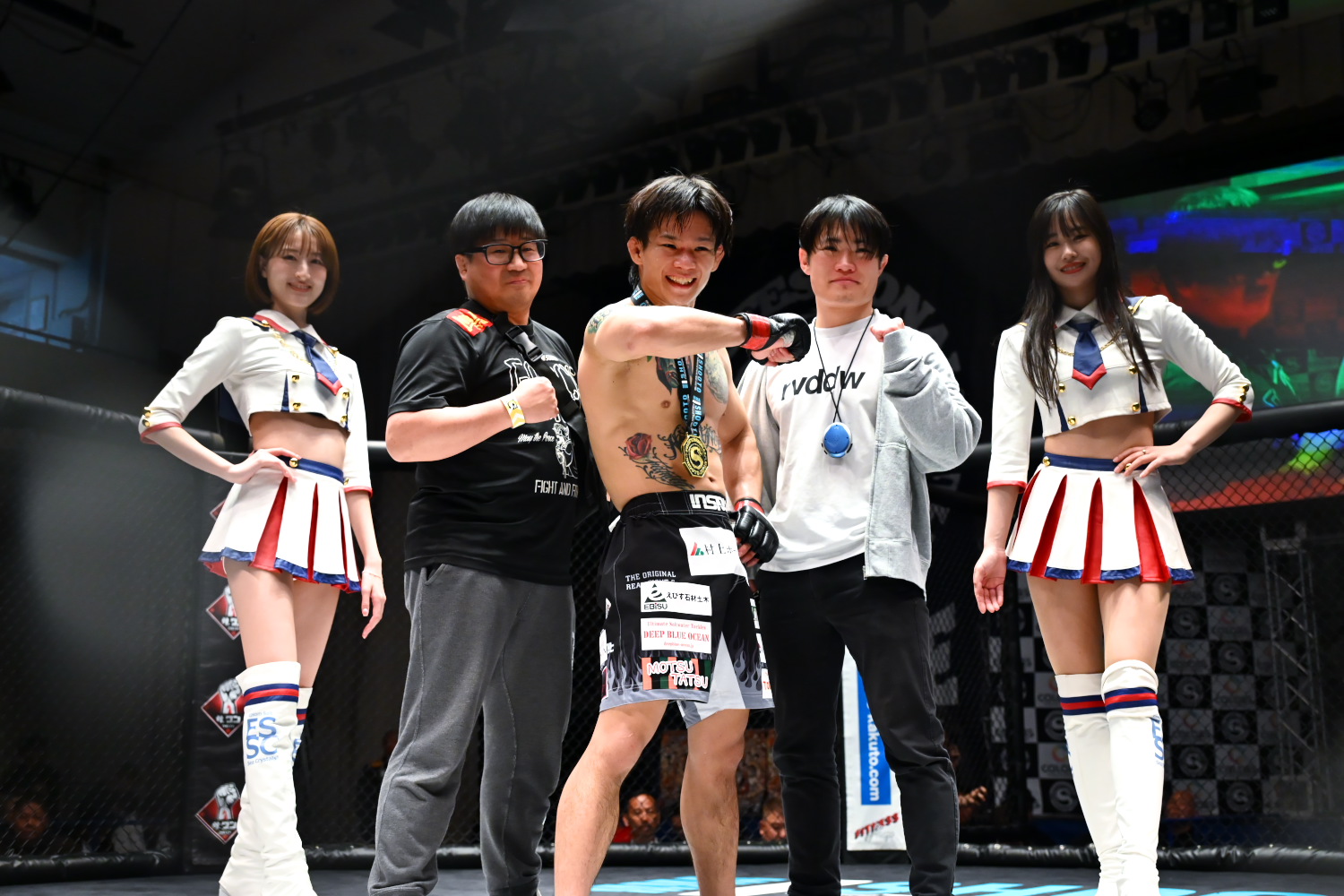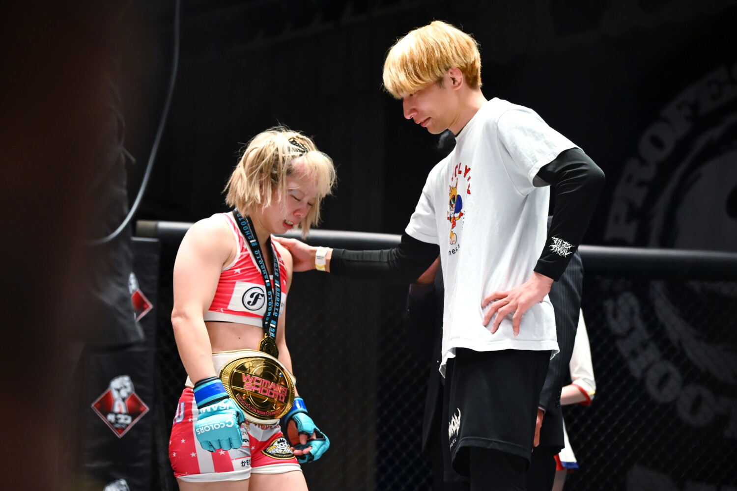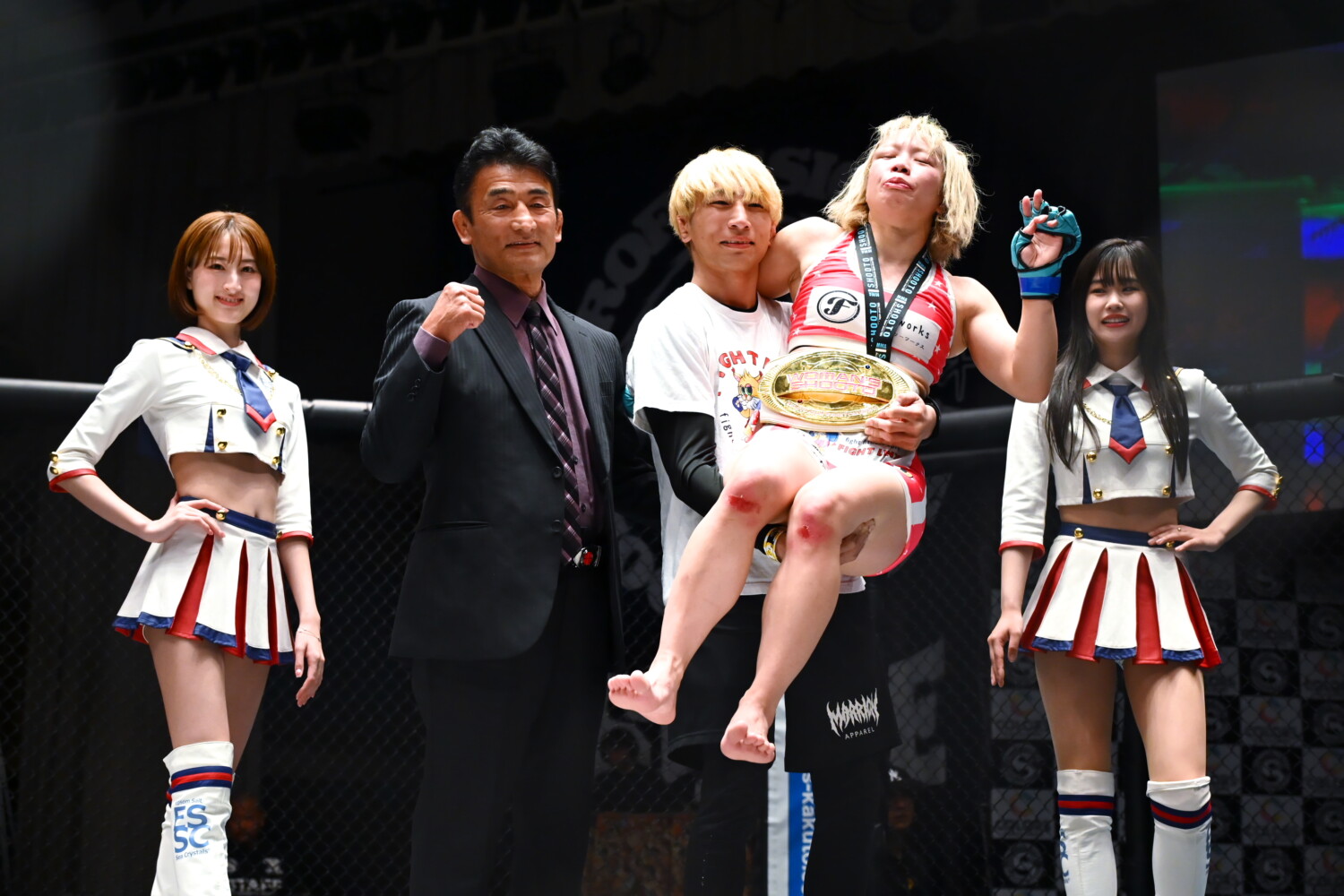 ベルトを巻いた青野は「私の原点はアマチュア修斗で、プロに上がるタイミングでは修斗の女子が無くて、DEEPを選択しました。だんだん修斗の女子が盛り上がる中、この舞台に憧れていました。義理の父は初代修斗ウェルター級王者の渡部優一です。旦那は修斗という名前でこのベルト取るべきだと思っていました。後楽園は義理の父が35年前の今日、ベルトを取った場所です。運命だと思って、絶対にベルトを取ろうと思いました。これからは修斗の女子の顔になれるようベルトの価値を高めます」とアピールした。すると修斗と優一氏もケージに入り、優一氏は「35年前、ここで生まれたばかりの修斗を抱き上げました」と話し、修斗が青野を抱き上げて記念撮影した。