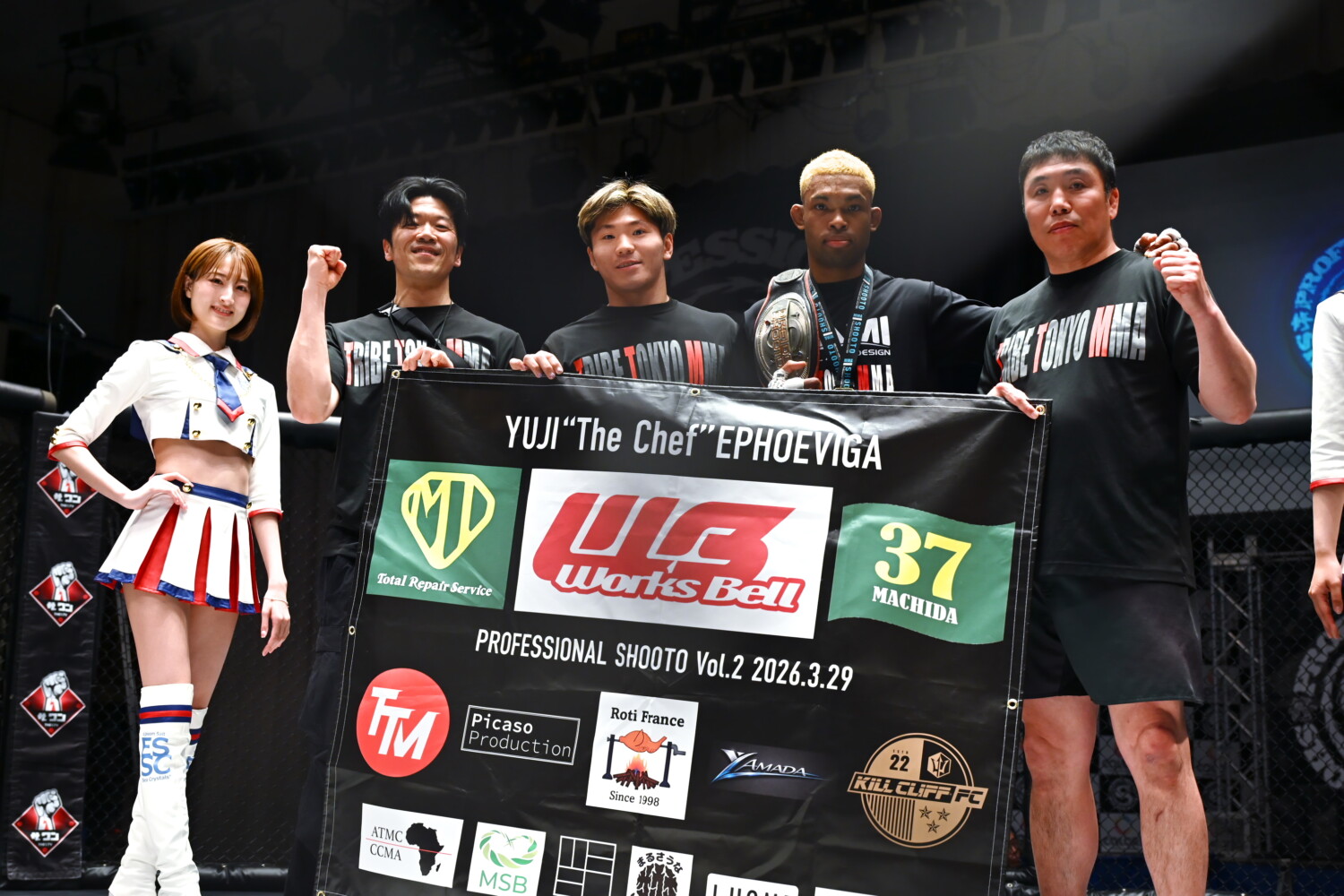 エフェヴィガは「前回1月に負けてタイトルマッチで疑問に思う人多かったでしょうし、自分もそう思っています。でもこれも神に与えられたチャンスと思って、8週間のきつかったファイトキャンプを乗り越えました。長南さん、堀江さん、後藤さん、家族、友達、スポンサーの助けもあってここまで来られました。でも修斗のベルトがゴールじゃありません。平良達郎選手が修斗でチャンピオンになってUFCで世界で戦っていて、自分もその選手になりたいです。(5月からの)Road To UFC、間に合うかわからないけど出たいです」とアピールした。