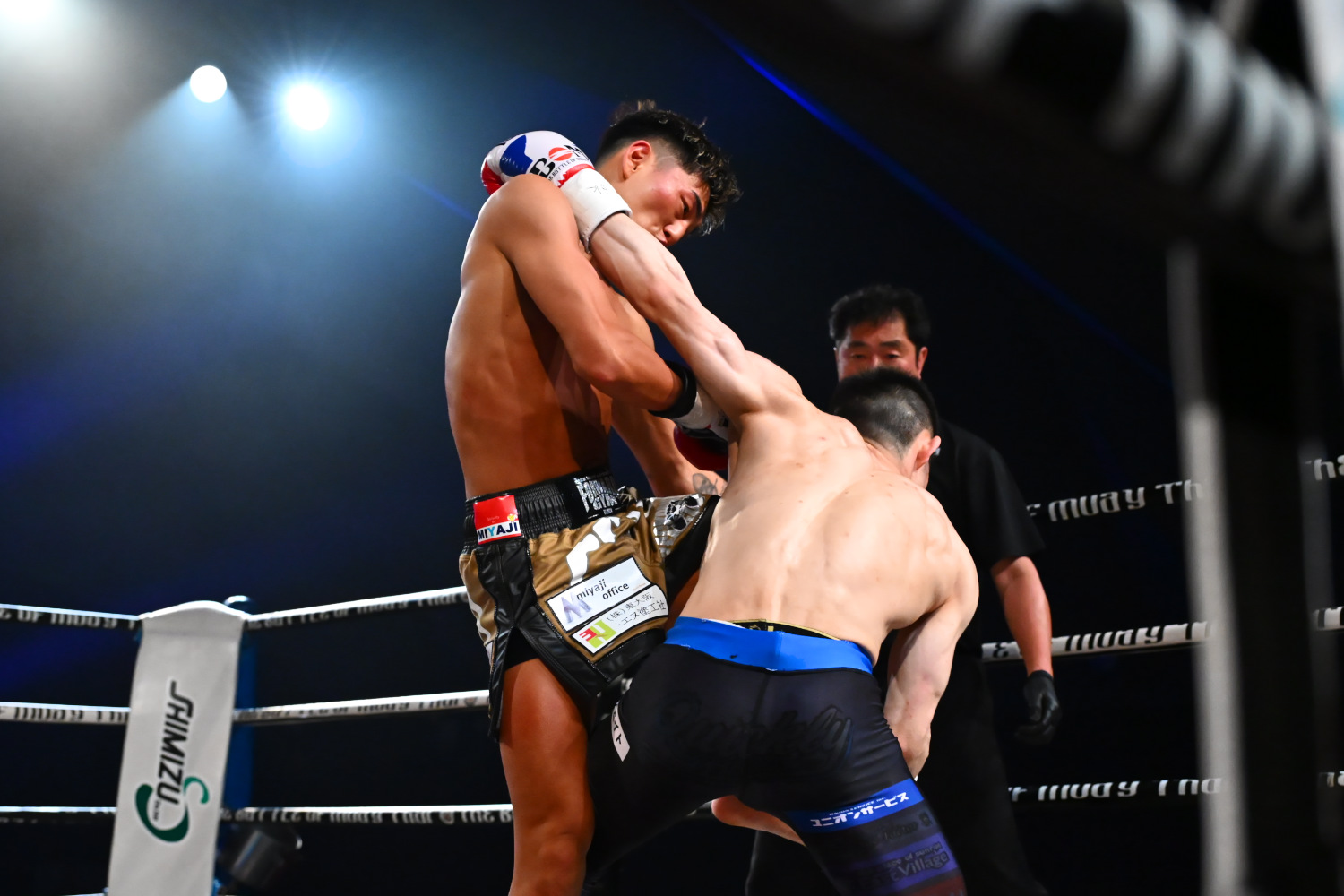 2R、シンイチは左ミドルや三日月蹴りを当てつつ、首相撲からの膝蹴りのヒットを増やし、崩しも絡めて主導権を握る。記者採点はシンイチ。