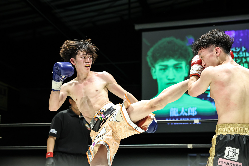 メインで組まれた龍太郎(VALIENTE)と林ジャッカル裕人(心将塾)の一戦はジャッカルより身長が10㎝も低い龍太郎が接近してからの相撲の寄りのようなプッシュで攻略。セコンドからの「どんどん突っ込んでいけ」というアドバイス通り、左ストレート、右ボディフックで再三ジャッカルをロープやコーナーの際まで詰め窮地に追い込む。