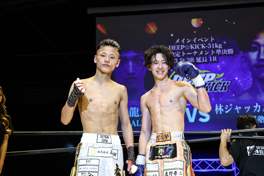 辛くも勝利を得たジャッカルがいるリングにセミファイナルで佐々木昊生を破った泰生がリングイン。両者はチャンピオンベルトを賭け、6月7日の「DEEP☆KICK 78」で激突するが、それぞれ抱負を述べた。