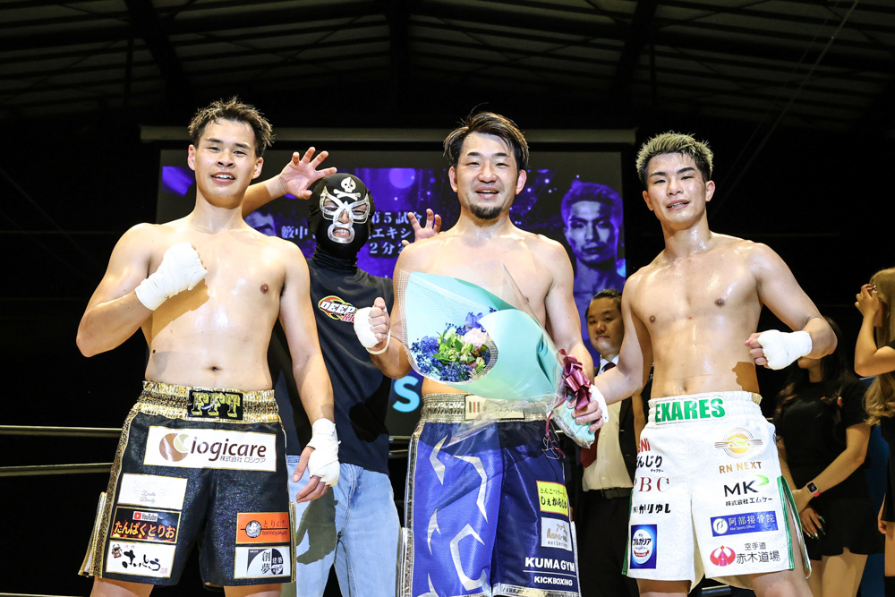 籔中謙佑(KUMA GYM)の引退エキシビションは藪中と親交の深い大森隆之介(EX ARES)と和田哲平(FASCINATE FIGHT TEAM)がそれぞれ1Rずつ相手を務めるという1vs2マッチに。レフェリーは試合当日に立候補した戦闘員1号が裁いた。これまで苦しいとき、何かと藪中に相談してきた仲だという。