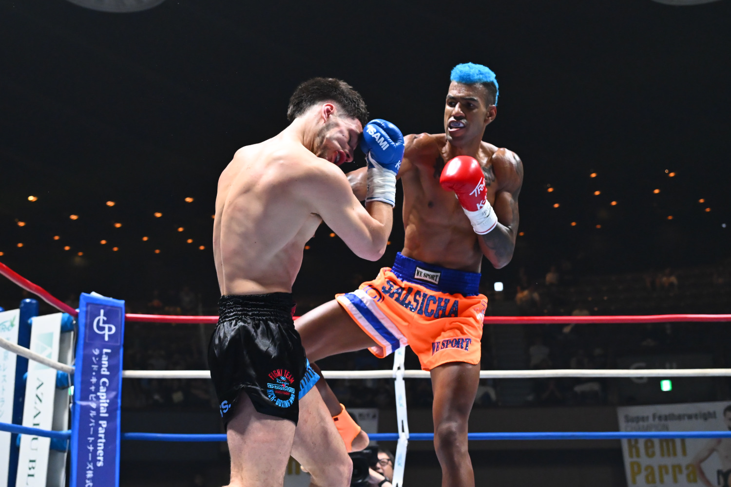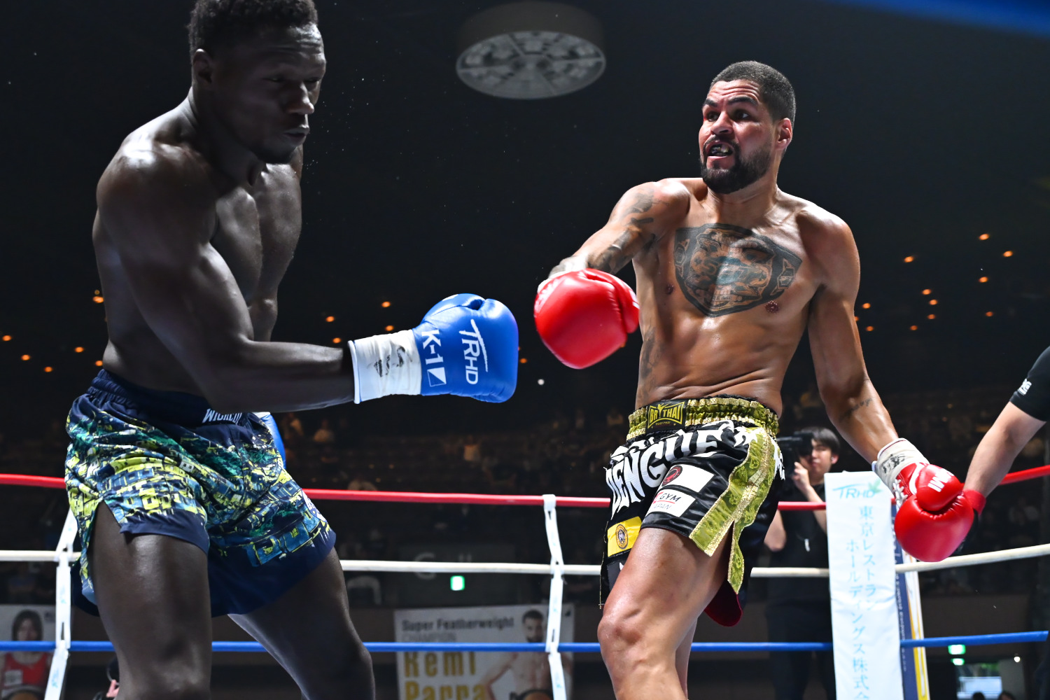 1R、デングがサウスポーで構え、中央に立ちプレッシャーをかけ、左ミドルを当てるが、ストレート等のパンチはまだ距離が遠い。アルフォセヌーもなかなか攻撃が返せないが、終了間際にカウンターの右フックを当ててどよめかせる。記者採点はイーブン。