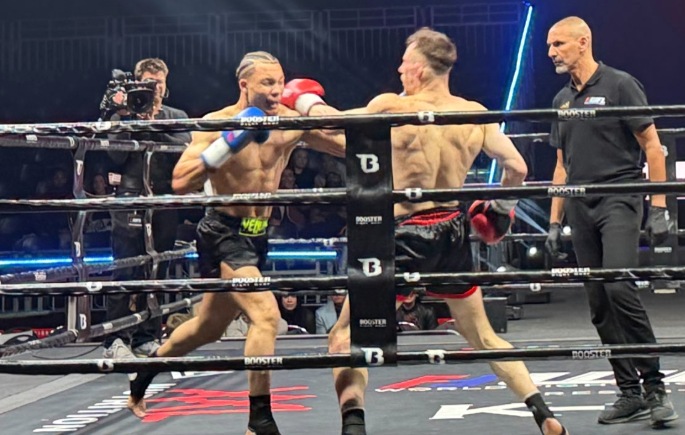 1R、スピードのあるケスキンは鋭いパンチのコンビネーション。タトは紙一重でかわし、右のパンチからヒザ蹴りへつなげる動き。試合をリードしているのはケスキンだが、打ち合いでタトが左フックをヒットする場面も飛び出した。