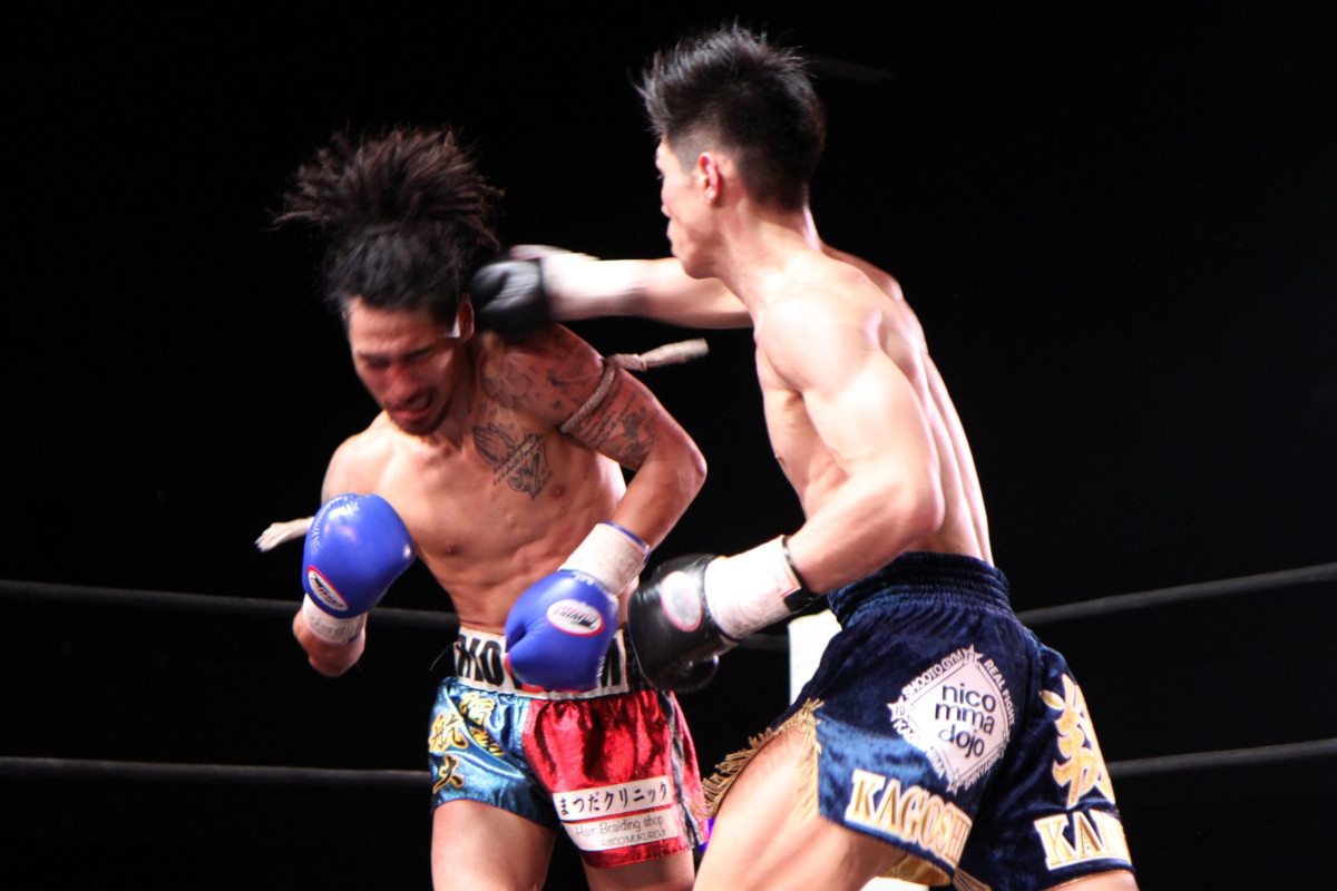 KOSフェザー級絶対王者である北薗が、ランキングを上げてきた稲津との防衛戦。序盤は稲津がパンチ、肘で北薗を倒すか?の場面も見られたが、中盤以降には北薗が本領発揮し、ハイキック、奥足ローキックを効かせて稲津を追い上げる形となり、結果は痛み分けのドローとなり、北薗のドロー防衛となった。