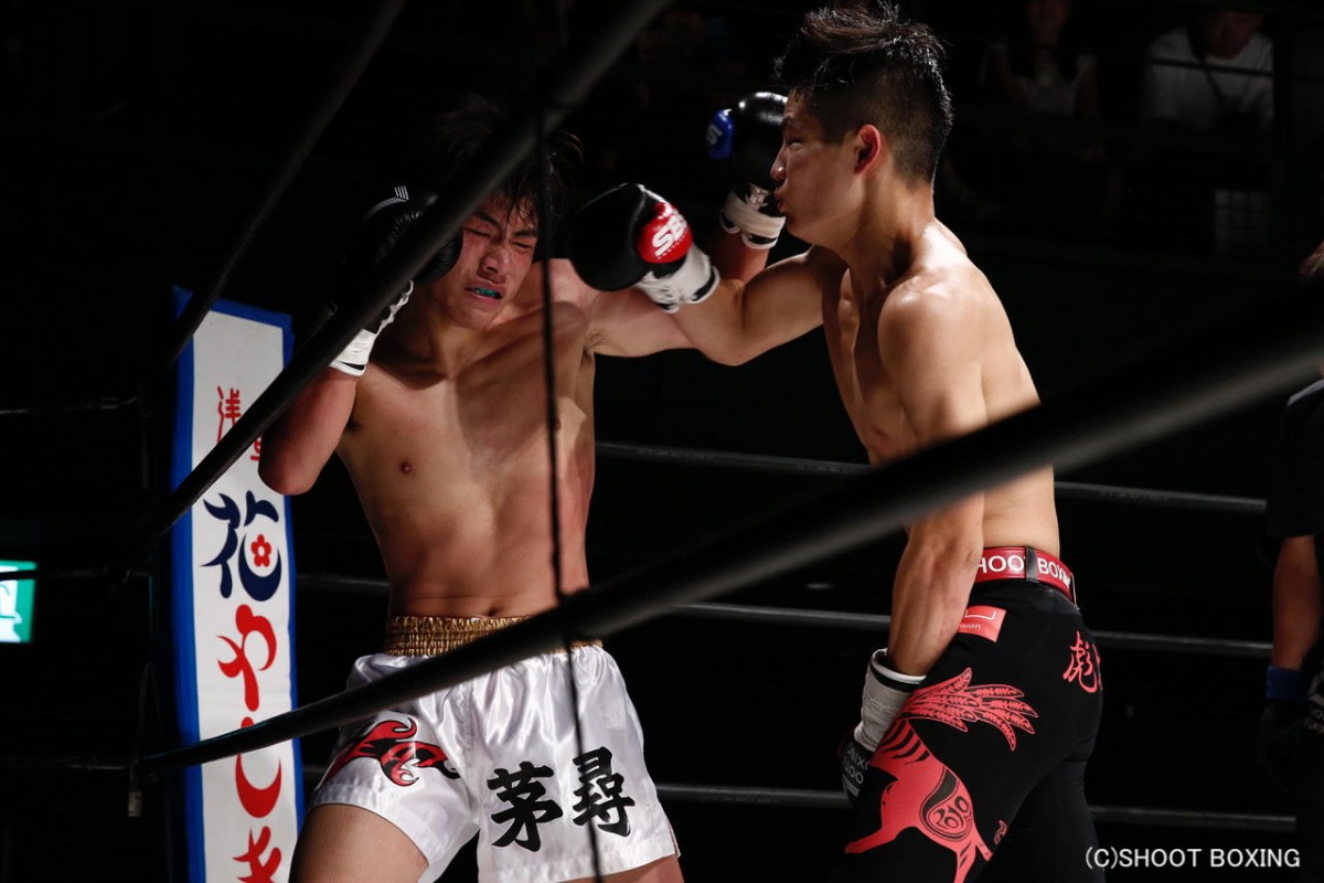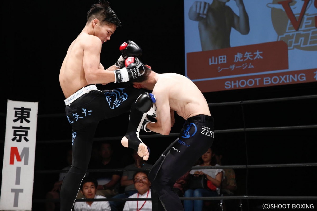 山田ツインズの弟、虎矢太は1Rからプレッシャーをかけて左ミドル、組んでのヒザ蹴りで優勢。仲田が下がったところを見逃さず、一気にラッシュを仕掛けてヒザ蹴り連打でダウンを奪う。そして、回転しながらの右ハイキックもクリーンヒットさせ追加のダウン奪取。最後にバックブローからのヒザ蹴り連打で3度目のダウンを奪いTKO勝ちした。