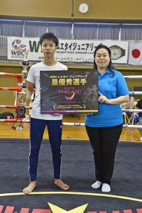 全国各地より勝ち上がり熱戦を繰り広げた選手の中から、最優秀選手(MVP)にはU15中学生50kg未満でチャンピオンになった山口瑠[るい](NJKF拳心會館/写真)が選ばれた。山口には、タイ国政府観光庁より3泊4日バンコク観光・ムエタイ観戦ツアーが贈呈された。