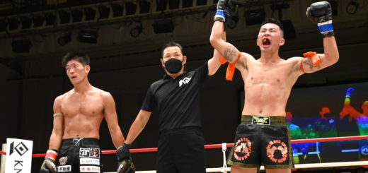 18歳同士(空龍は早生まれ)の第1試合。1R、空龍が積極的に蹴りを出し続けるが、終盤、心直がサウスポーからの蹴りをまとめ持ち直す。2Rもその流れで、心直がやや蹴り数多く攻め優位に。3R、空龍が右フックで心直をひるませ、その後もパンチで追い詰める。結局これで追いつく形となりドローに終わった。