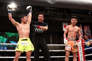 2Rは佐藤も左インロー、右ミドルを返し、距離をうまく取って、結城は少し攻めあぐねる状態に。3R、結城は圧力を強め、度々右ストレート主体のパンチで佐藤をぐらつかせる。佐藤も打たれ強く、ダウンは取れなかったが、結城が健在ぶりを示すファイトで勝利した。