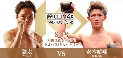 両者とも昨年、安本晴翔に完敗しており、今回勝って少しでも評価を高めたいところ。1R、回る駿太の細かいフェイントに対し、栗秋は少しせめ攻めにくそうだったが、終盤、飛び膝から強引に詰めると、パンチラッシュで左フックを当ててダウンを奪う。