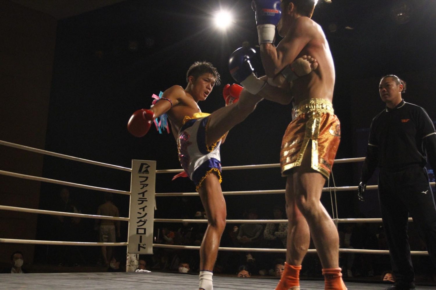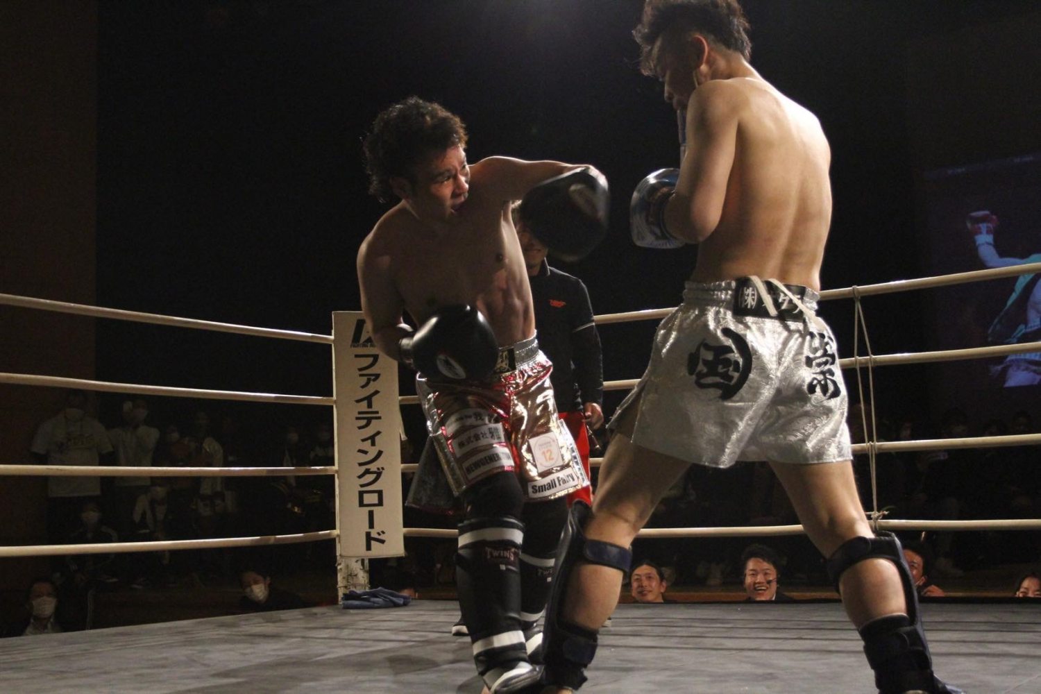 また、入場のダンスと果敢な攻めで場内を沸かせていた殿(心将塾)が引退。1週間前にスウェーデン人選手から勝利を収めたばかりの国崇(拳之会)を相手に引退エキシビションを行った。元NJKFスーパーフェザー級王者の大輔が特別レフェリーを務める中、殿は右ストレート、国崇は左ボディと互いの得意技を繰り出し合った。