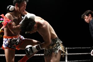 2R、1分ほど経過してから佐々木がオーソドックスにスイッチ。山田はすぐに動きを切り替えて右ローを当て続けるが、佐々木の右ミドルも当たり出し、終盤の首相撲の展開ではコカしを決め、流れを引き寄せる。