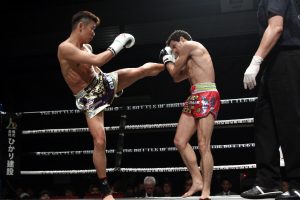 1R、サウスポーの安東、オーソドックスの栄基の、ミドル主体の蹴りの応酬。2Rも同様のミドルの応酬の中で、栄基は右ハイ、安東は距離を詰めてのパンチも目立つように。