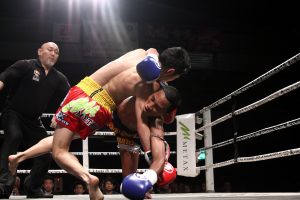 3R、途中までトゥアントーンも前に出て、膝蹴りを当てていたが、名高が左ミドル、左ロー、左ボディストレート、左膝、右肘を当て続けて圧倒する。
