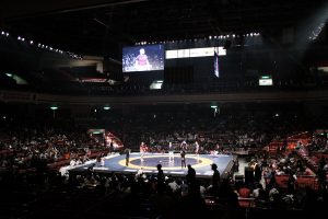 12メートル四方のレスリングマット。場内場外のエリアは設けず、試合場から転落しそうな場合は審判の判断により試合を中断し、安全な位置から両者同じ態勢のまま試合を再開する。