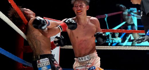 すると3R、与座が左ミドルを効かせてから、胴廻し回転蹴りをまたも当て、今度は喜入が倒れてダウン。ダメージの残る喜入に、与座が二段蹴りの形で左ミドルを当てて下がらせ、パンチ連打で防戦一方にしたところでセンチャイ・レフェリーがストップ。与座が空手の大技を活かし快勝した。