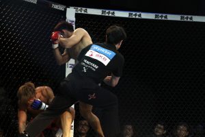 2R、室伏が右ロー、右フック、右ハイを当て続けると、少し砂辺はローをもらった左足を引きずるように。室伏がコーナーに詰める場面も目立つようになり、逆に砂辺が前に出て詰めようとすれば室伏はケージを大きく使って回ってかわし、自在に戦うようになってきた。