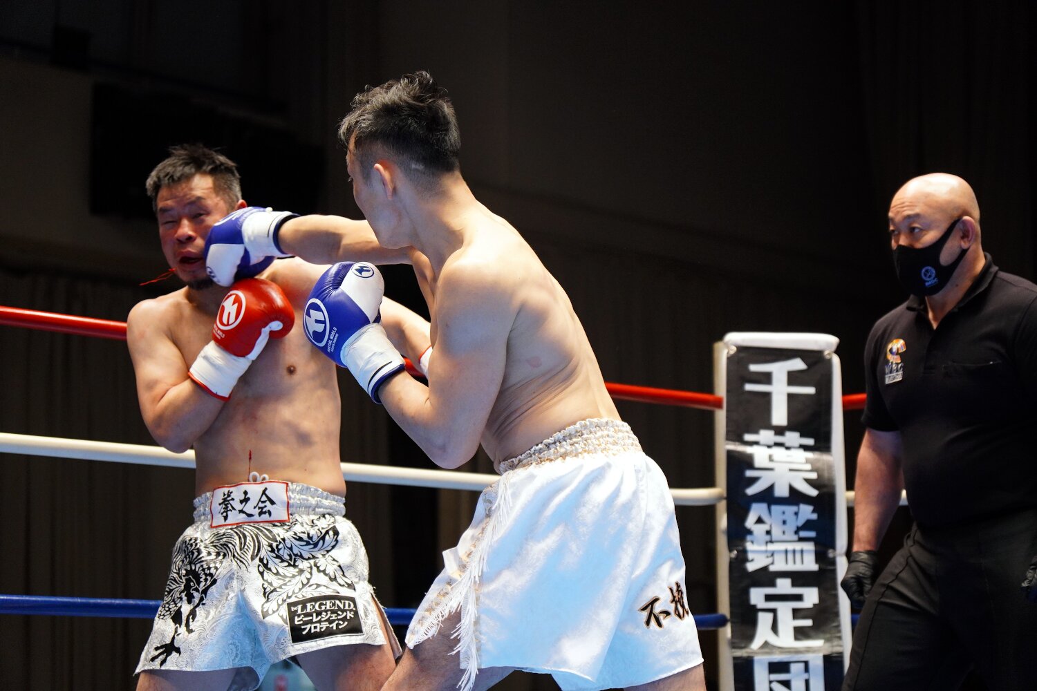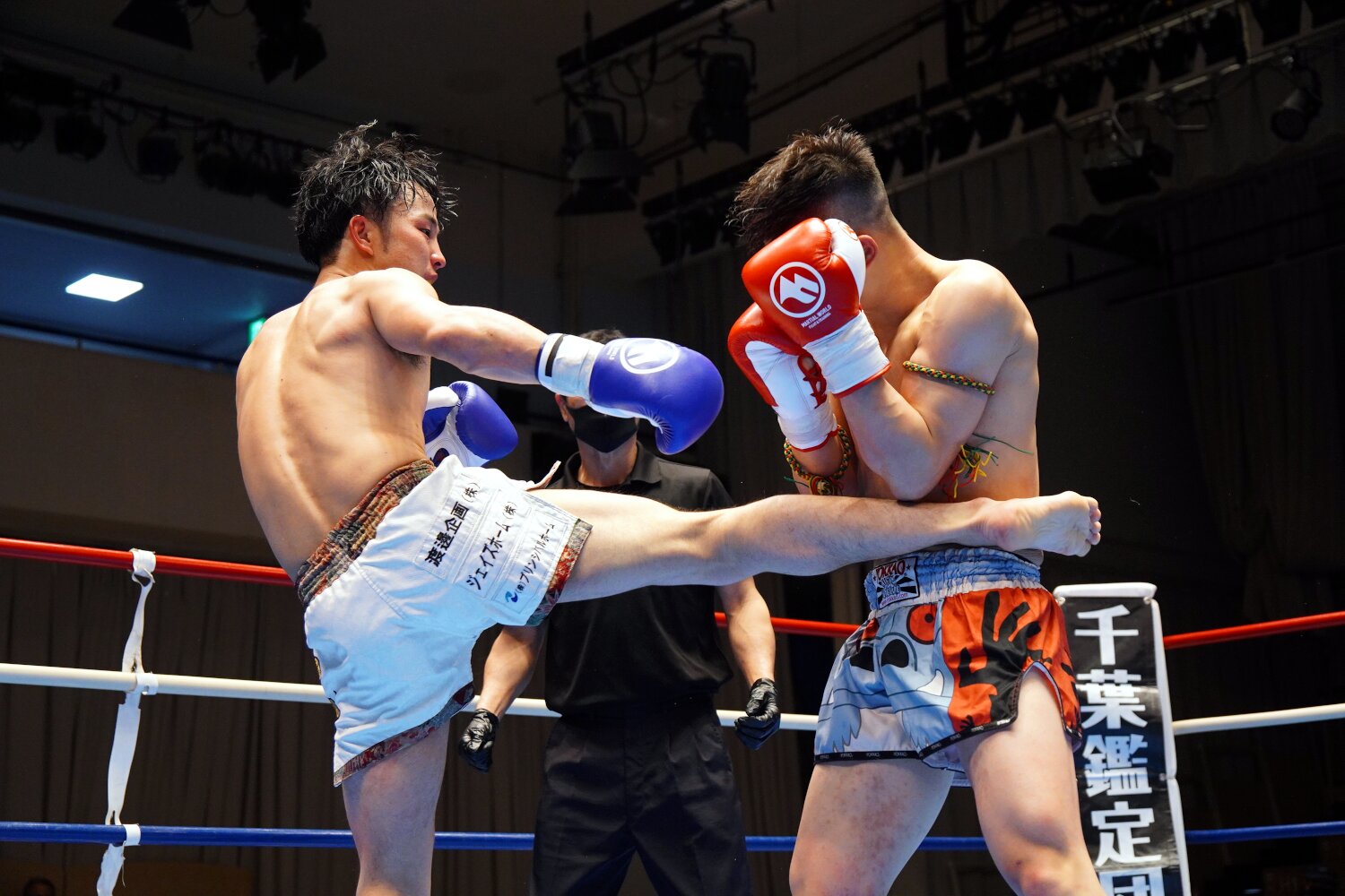 2R、一眞は執拗に左右のローをヒット。健太は足が赤くなり、少しバランスを崩しそうになるが持ちこたえる。健太は随所で右ロー、右ストレート、左ミドルを返し続け、はっきりと差をつけさせない。