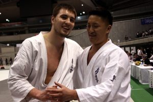 だがグリアエフが左右のローをコツコツ当てていると、南原は少し左足を引きずるような動きに。3分の本戦の終盤に差し掛かり、グリアエフが右ローを当てると、南原はスリップ。グリアエフがすかさず残心のポーズを決めて技有りを奪う。残り時間は短く、南原は挽回できず終了。悲願の10代での全日本制覇はならなかったが、同世代の強豪グリアエフ相手に戦った経験は秋の無差別の全日本大会でも活きるだろう。(右下写真は試合後に健闘を称え合う両者。南原はグリアエフに「またやろう」と笑顔で呼びかけた)