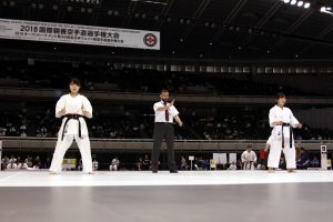 現行のフルコンタクトルールと並行採用する「セミコンタクトルール」の説明が、4月22日の大会の中で行われた。伝統派の全日本空手道連盟(全空連)のいわゆる寸止めルールとフルコンルールの中間のようなルールで、防具着用・顔面寸止めあり・ローキック無し等が主な特徴。「I.K.O.セミコンタクトルール2018全国交流大会」(6月3日(日) 大阪府立体育会館)で初採用される。昨年の全日本無差別大会優勝の高橋佑汰、同4位・上田幹雄がルールに基づき実演した。