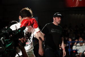 2R、神戸が左ボディを効かせて少し伊澤が嫌がる場面もあったが、中盤、伊澤が変則のローを当て続けていると、神戸はバランスが悪くなり後退するように。記者採点は9-10で伊澤。