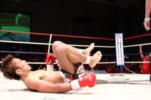 1R、蹴りの応酬が続き、ほぼ互角だったが、伊藤が軽く放った感じの左ストレートで、和夢が尻餅をつきダウンが宣告される。
