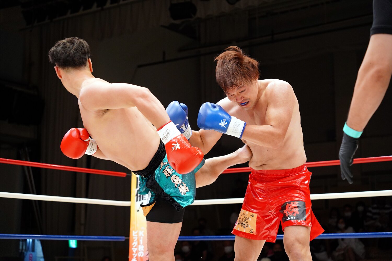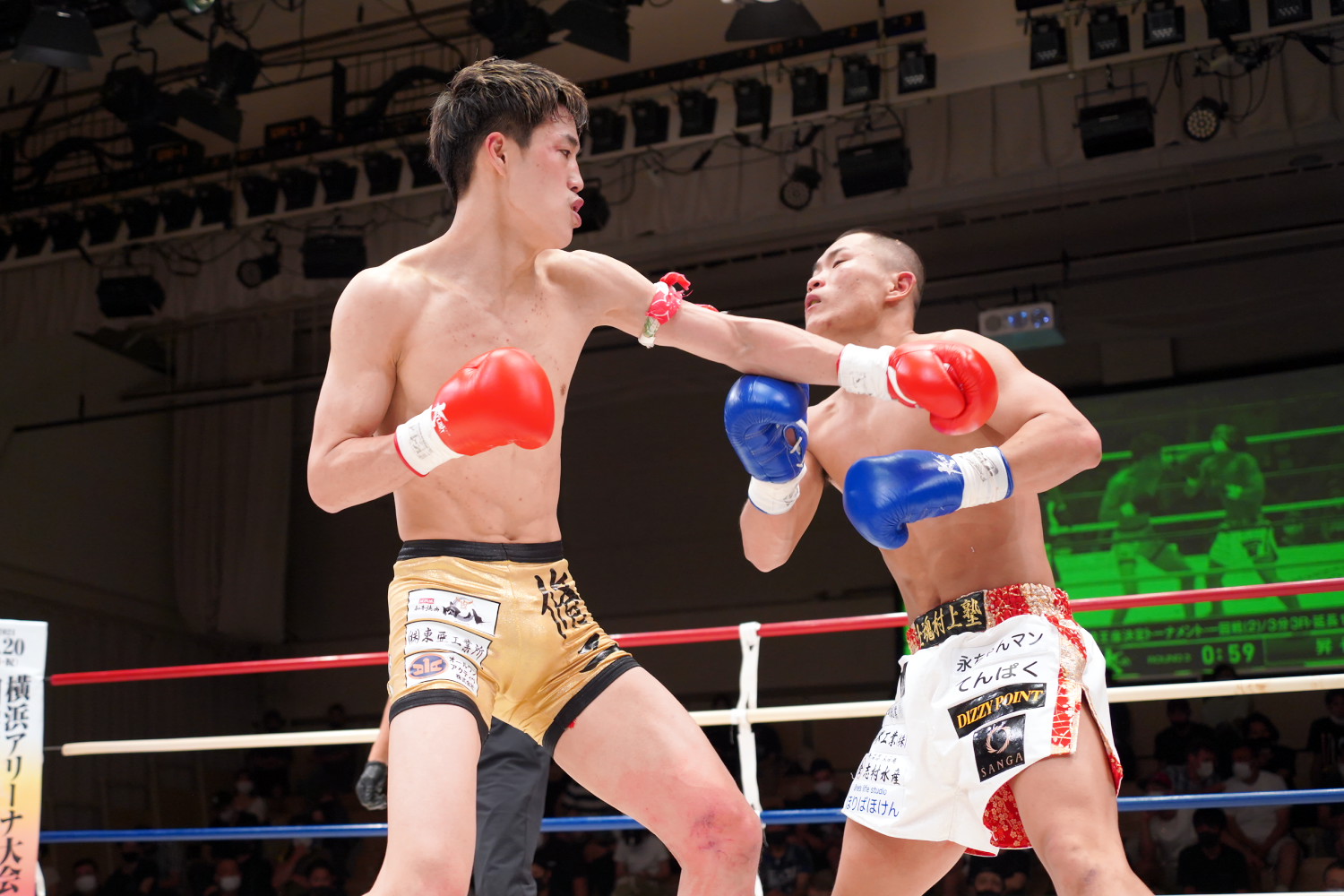 1R、序盤から昇也がサウスポーに構えて圧をかけ、パンチの連打で瓦田を下がらせ先手を取る。だが瓦田は少しずつガードの隙間からパンチを当てるようになると、右ミドル、テンカオ、左ボディも絡め、終盤は手数多く攻めて昇也を追い詰める。記者採点イーブン。