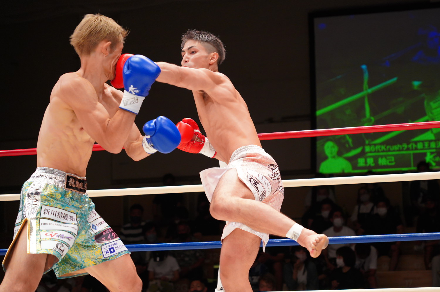 1R、圧力をかける川崎に対し、サウスポーの里見が回って距離を取り、左フック、左ローを当て、やや優位だったが、中盤以降、川﨑も距離をつかむと、右ストレートでスリップさせ、終盤にはロープに詰めて右ストレートを随所で当てて、やや優位に転じる。記者採点はイーブン。