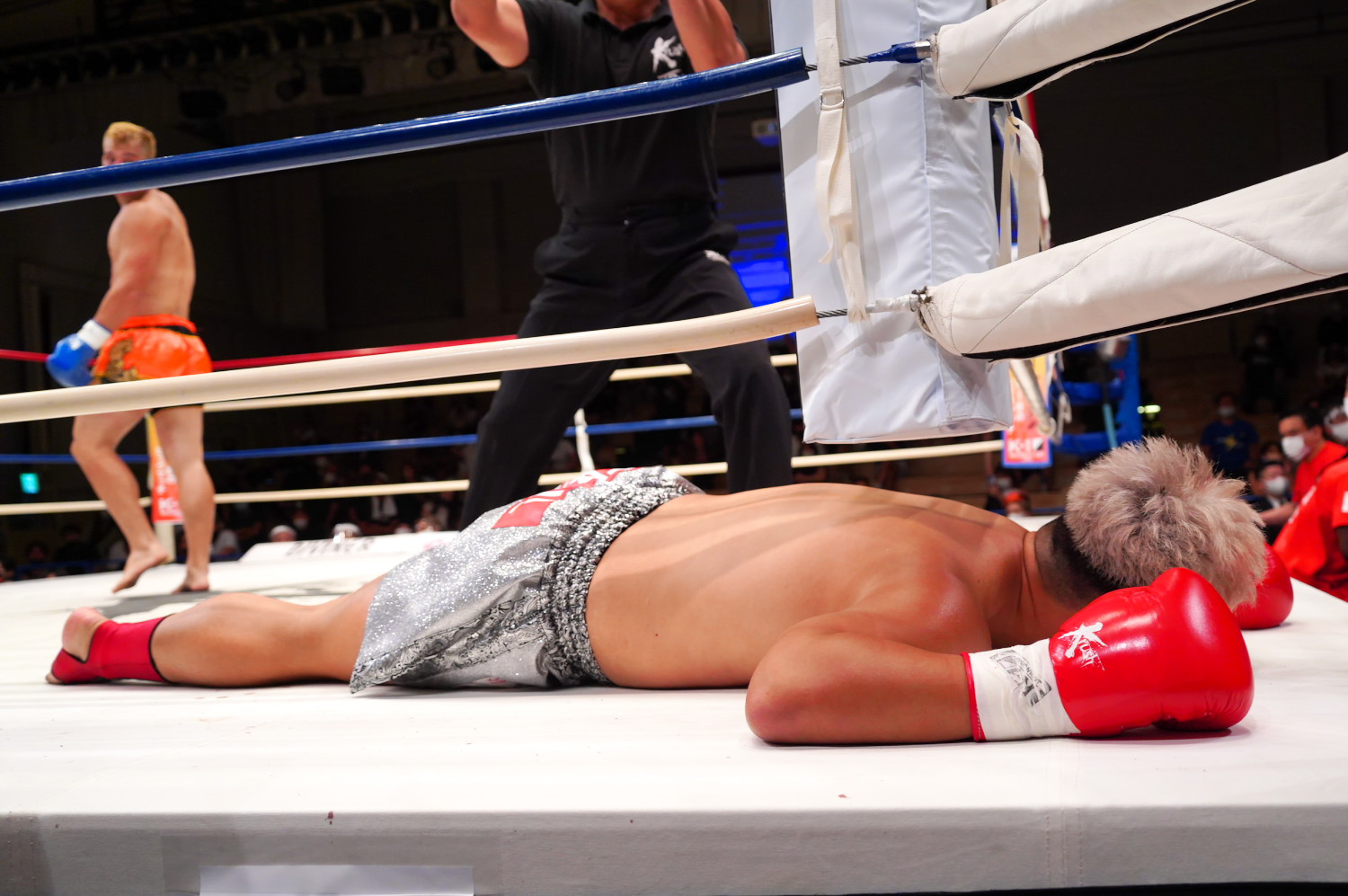 2R、川﨑は変わらず前に出るが、里見は上手くさばくようになると、左ハイ、ローと攻撃を散らしてから、左の三日月蹴りをヒット。川﨑が一瞬顔をしかめると、そのチャンスを逃さず、里見は左ストレートを効かせ、パンチの打ち合いでカウンターで左フックを当ててダウンを奪う。里見はさらに左ストレートでダウンを重ね、最後も左ストレート一撃でマットに沈めた。ダメージの大きい川﨑は担架で運ばれた。