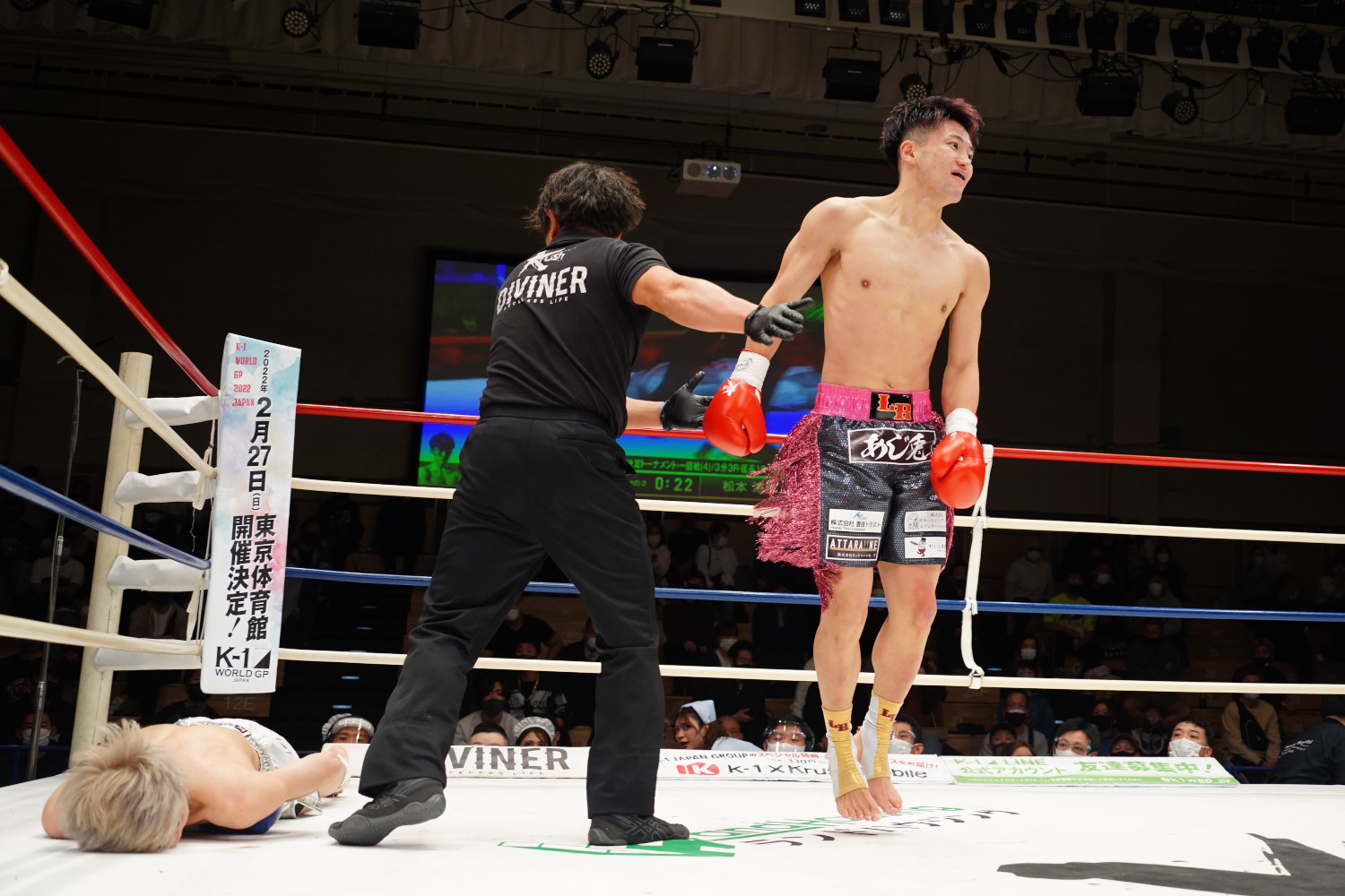 1R、林が序盤からプレッシャーを強め、中盤に右ボディを効かせつつ、パンチ連打からの左フックでダウン奪う。その後もパンチを当て続け、左と右のフックの連打で倒したところでレフェリーがストップした。林は「怪我で長い間できんかったんですけど、勝てて良かったです」と話しながら涙を流した。