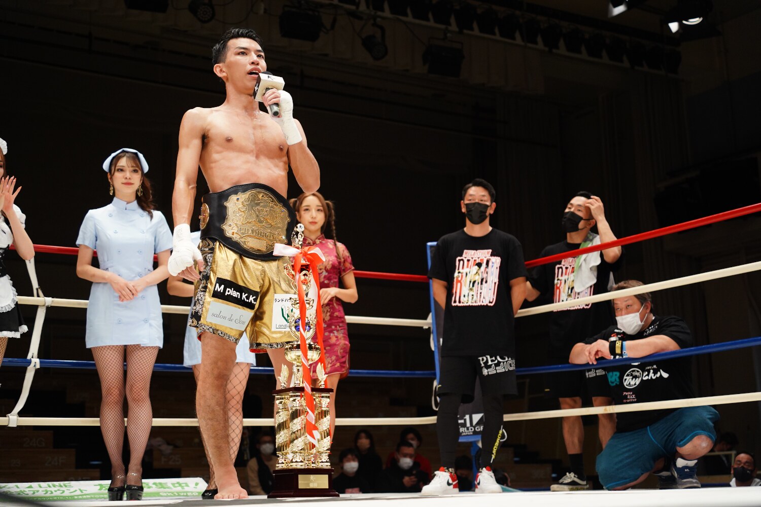 初のベルトを巻いた璃明武は「準決勝は判定でしたが、決勝はKOしたかったのでベルトを巻くことができてうれしいです。皆さんの応援のおかげで勝てました。目標はK-1チャンピオンですので、これからはそれを狙います」とアピールした。