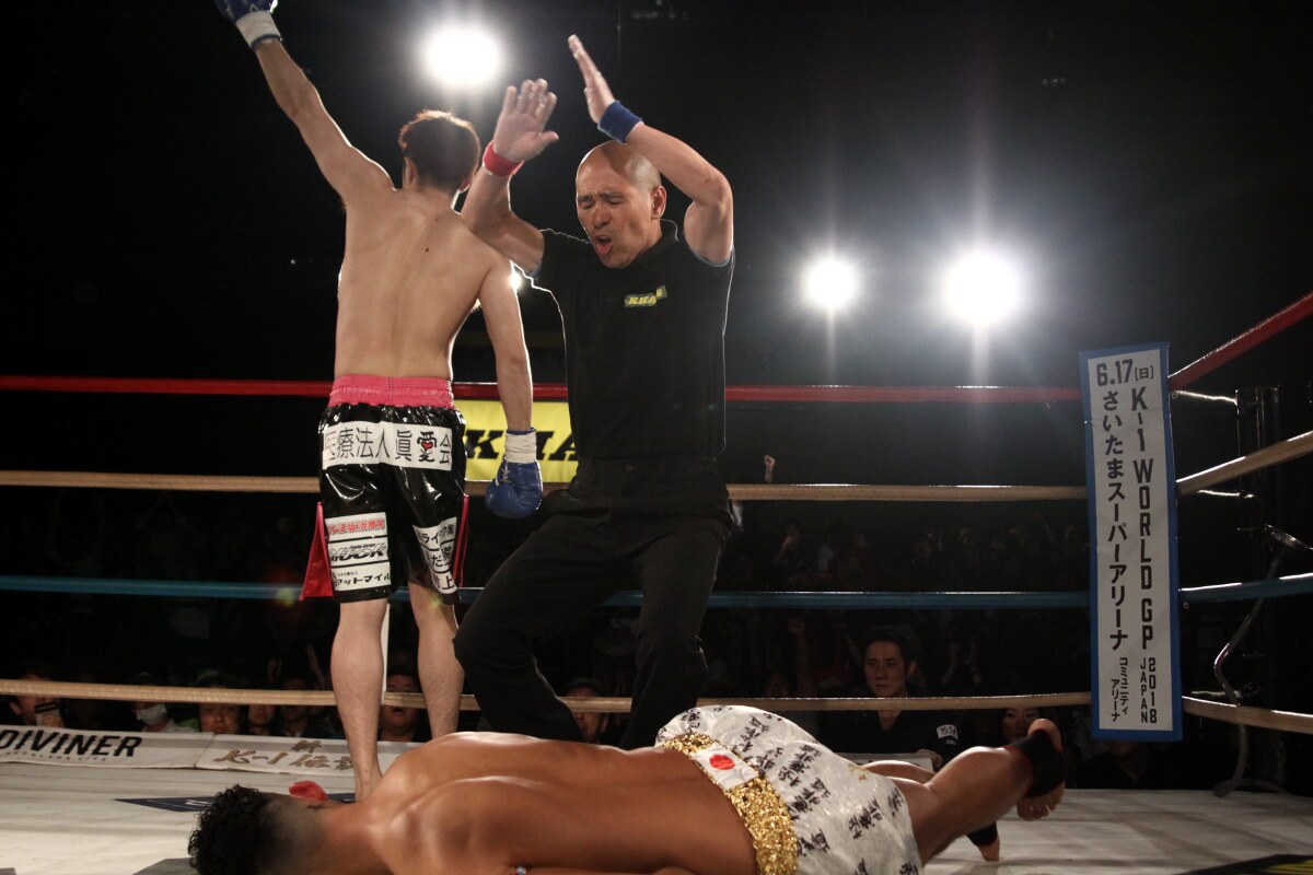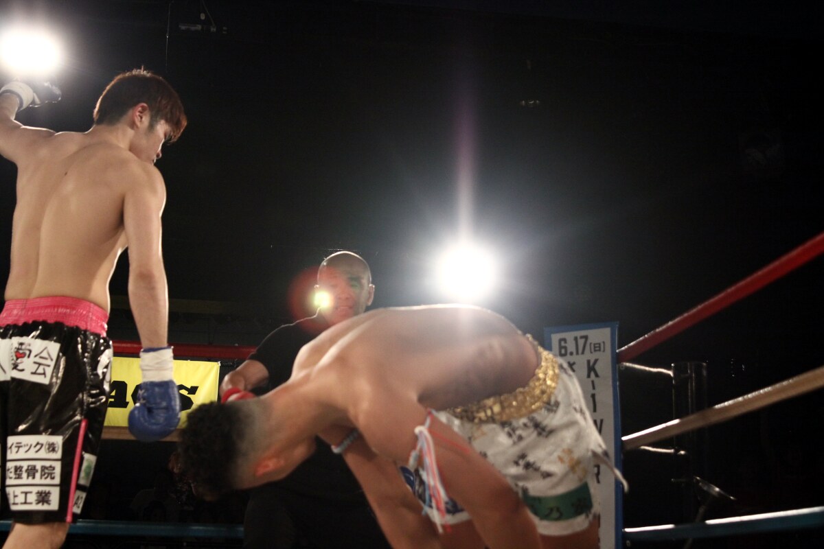 3Rもしばらく東本は蹴り主体だったが、差が無いか劣勢と判断したか?セコンドが「打ち合え」と指示すると、東本はパンチ主体に切り替え打ち合うように。すると少しずつ優勢になり、近藤はクリンチが増え、豊永レフェリーは警告を宣告する。その後も東本がパンチと左ミドルで押し気味に進めていると、クリンチになってブレイクがかり、少し後退した近藤を東本が追いかけ左フックをヒット。近藤はダウンし、立ち上がるも目が虚ろで、レフェリーがストップした。